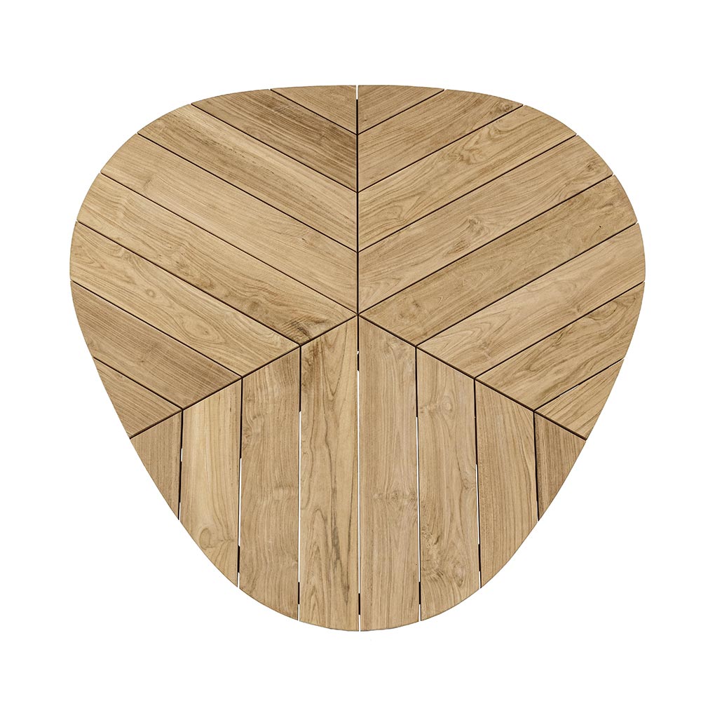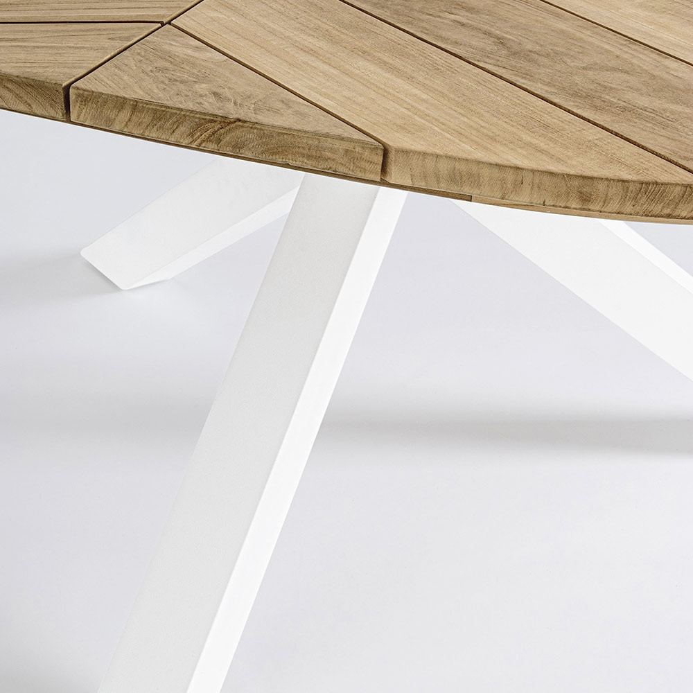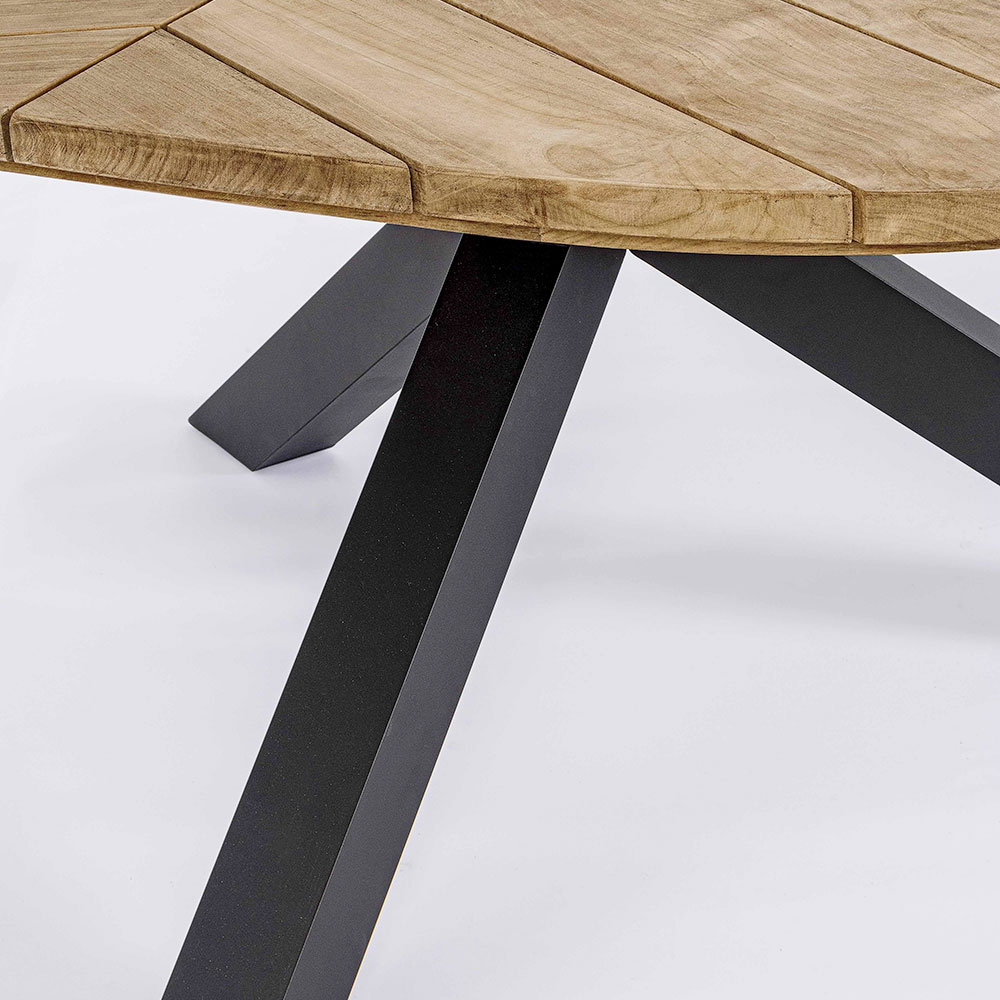 Kulatý venkovní jídelní stůl z hliníku s deskou z kvalitního teakového dřeva.