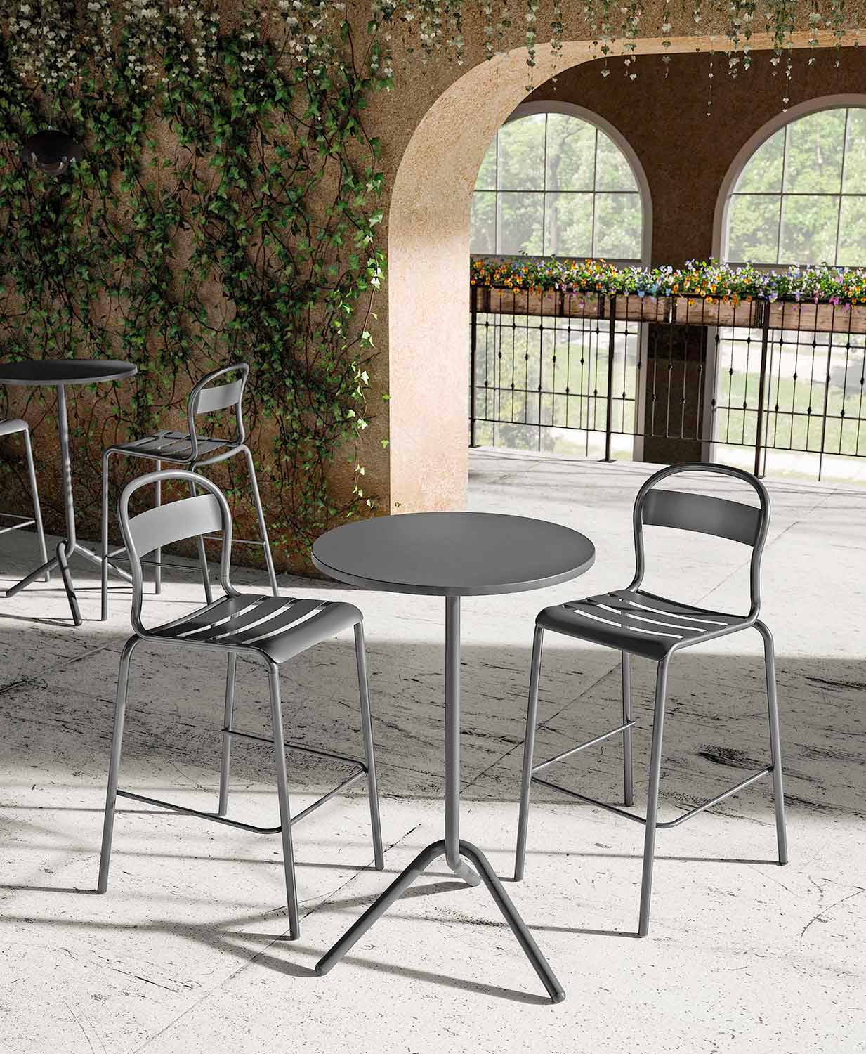 Venkovní kulatý vysoký stolek z kovu a stohovatelného a skládacího plechu Vyrobeno v Itálii.