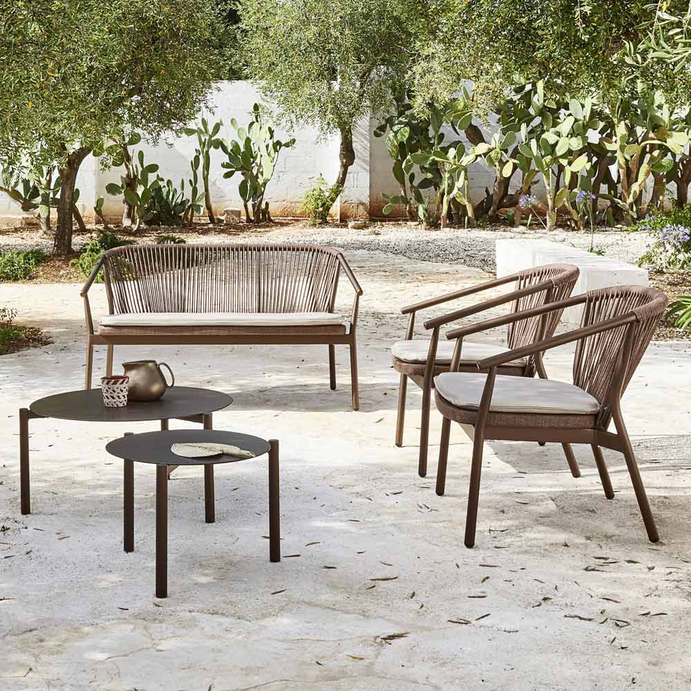 Zahradní konferenční stolek složený z desky a konstrukce z hliníku s práškovým nástřikem v kovové bronzové barvě. Díky svému lineárnímu, čistému a jednoduchému designu je tento konferenční stolek ideální pro zdobení jakéhokoli venkovního prostředí, jako jsou terasy, bazény a zahrady, a zároveň najde své místo v různých vnitřních obytných prostorech.