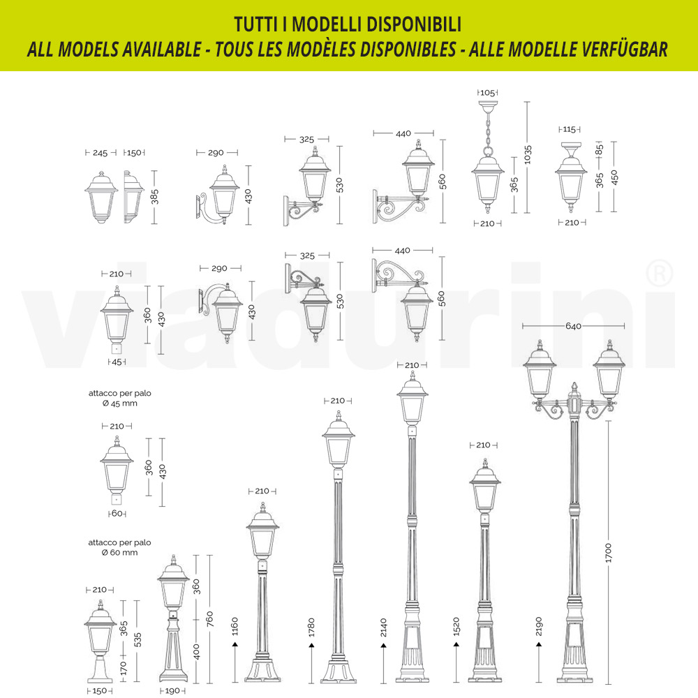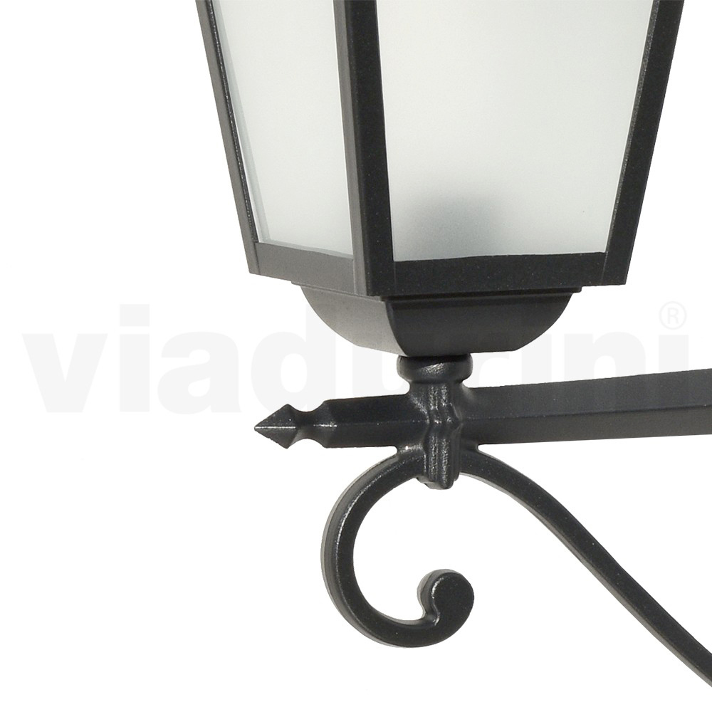 Zahradní lampa vyrobená z tlakově litého hliníku s antracitovou povrchovou úpravou a difuzorem z pískovaného skla , celá vyrobena v Itálii.