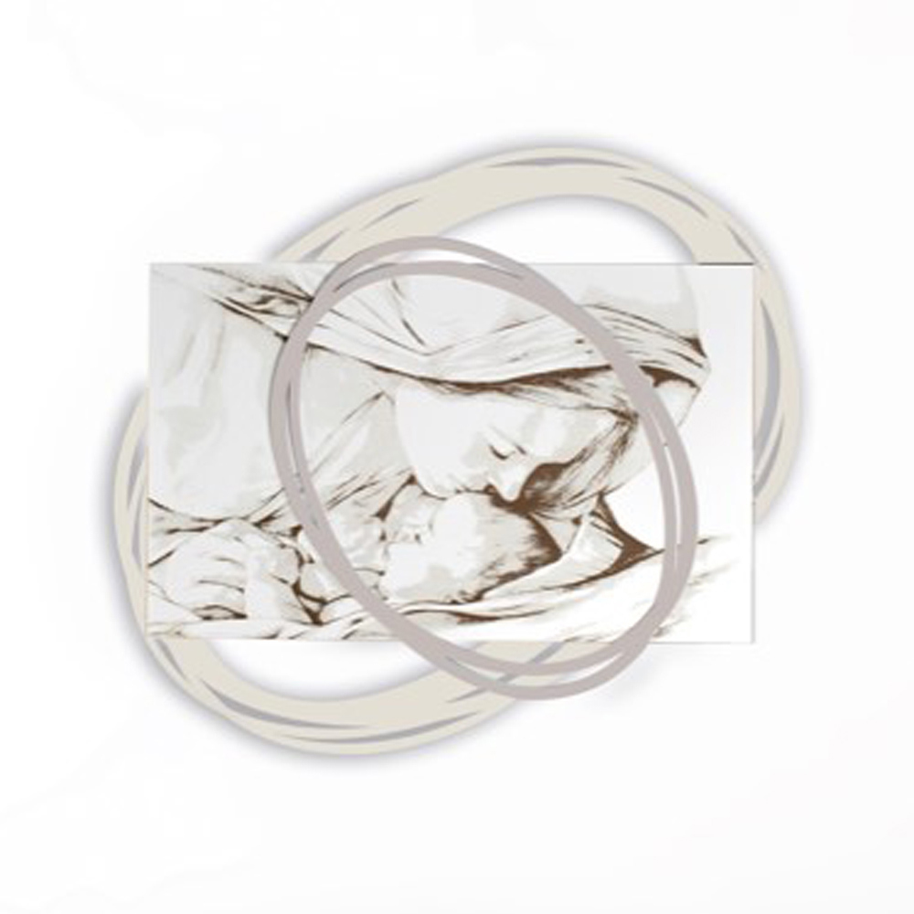 Čelo postele zobrazující polibek od Madony jejímu synovi díky laserovému značení, které ukazuje rysy tváří. Matně bílý lakovaný dřevěný panel s laserovým značením, speciální technikou, která na materiálech vytváří basreliéf.