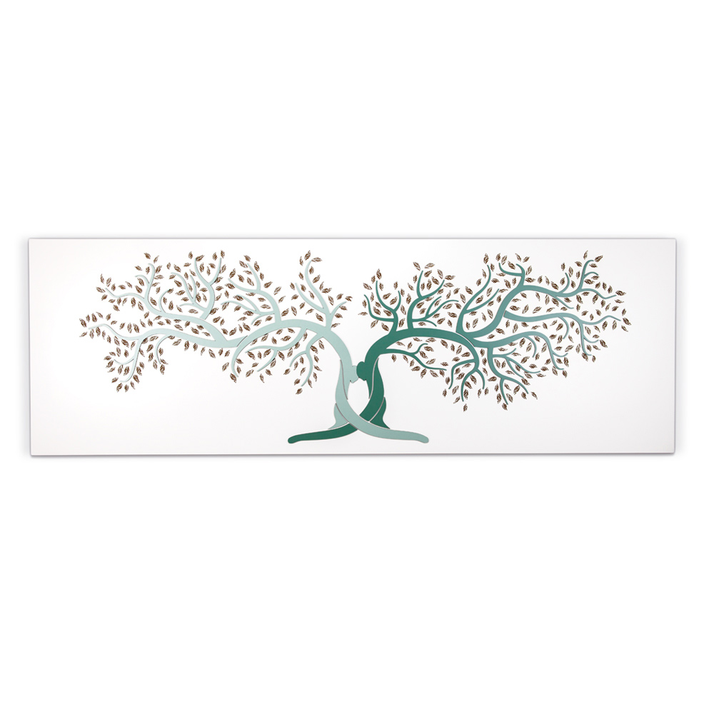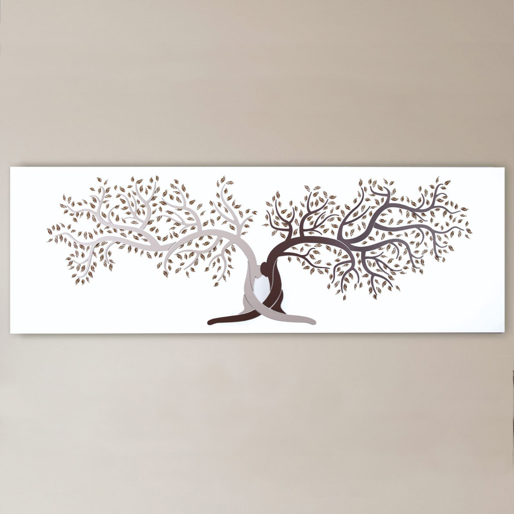 Dekorativní panel představující spojení dvou kmenů s objetím, symbol života. Větve a listy provedené laserovým značením se větví z kmene. Matně bílý lakovaný dřevěný panel s aplikacemi v lakovaném dřevě ve dvou odstínech štěrku a kakaa nebo v jeho zelené variantě a laserovém značení.