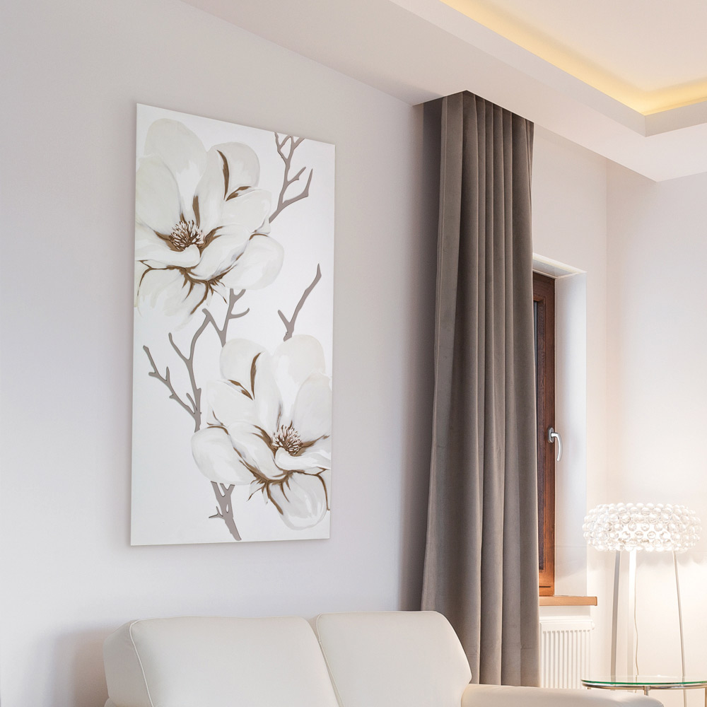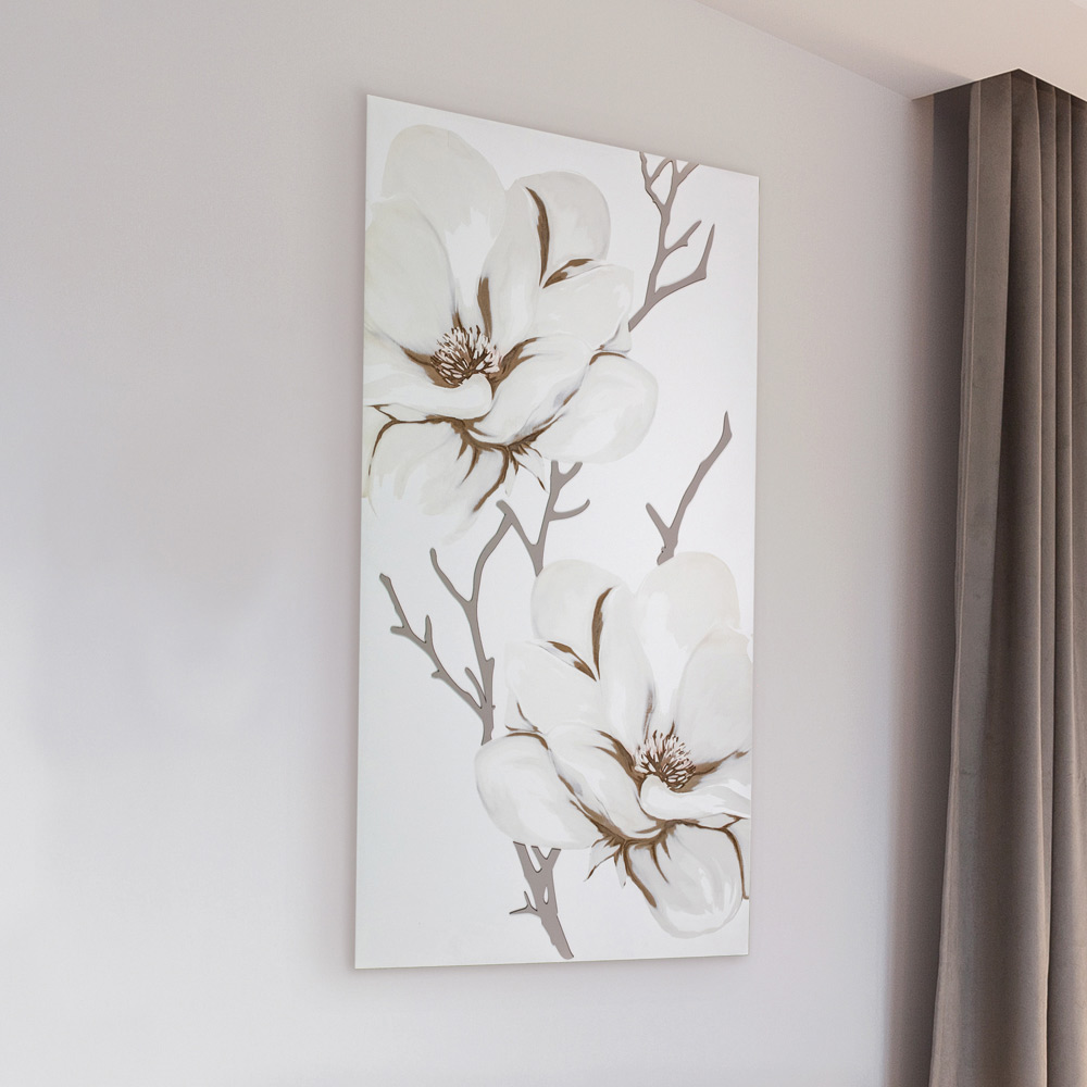 Panel s dekorací je vyroben technikou laserového značení , které vytváří na materiálu basreliéf a vytváří různé barevné přechody okvětních lístků vytvořených na panelu. Panel Magnolia je vyroben z matně bílého lakovaného dřeva s aplikacemi v oblázkové barvě . Elegantní kus nábytku se dvěma jemnými květy Magnolie, detailně gravírovanými laserem s oblázkovými dekoracemi.