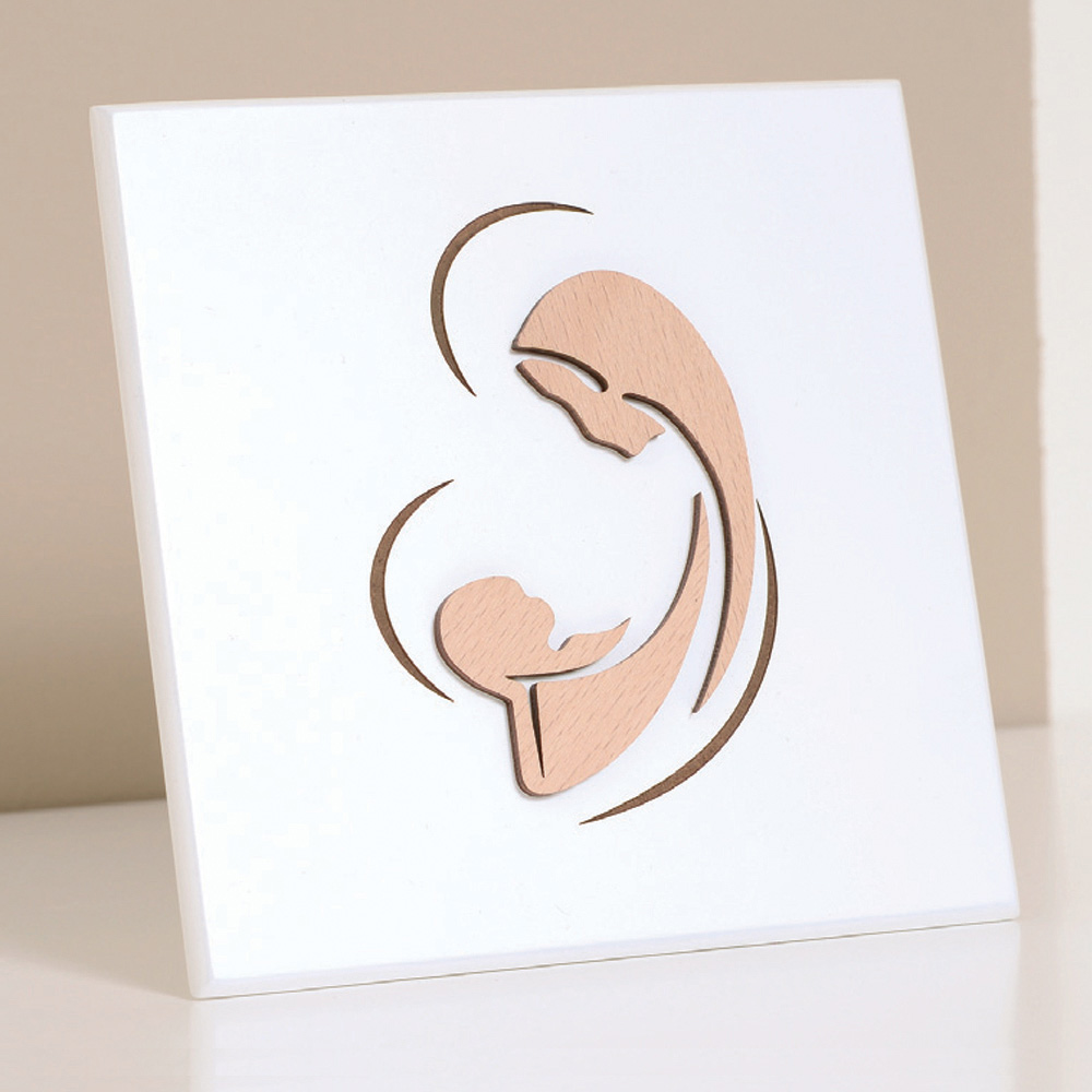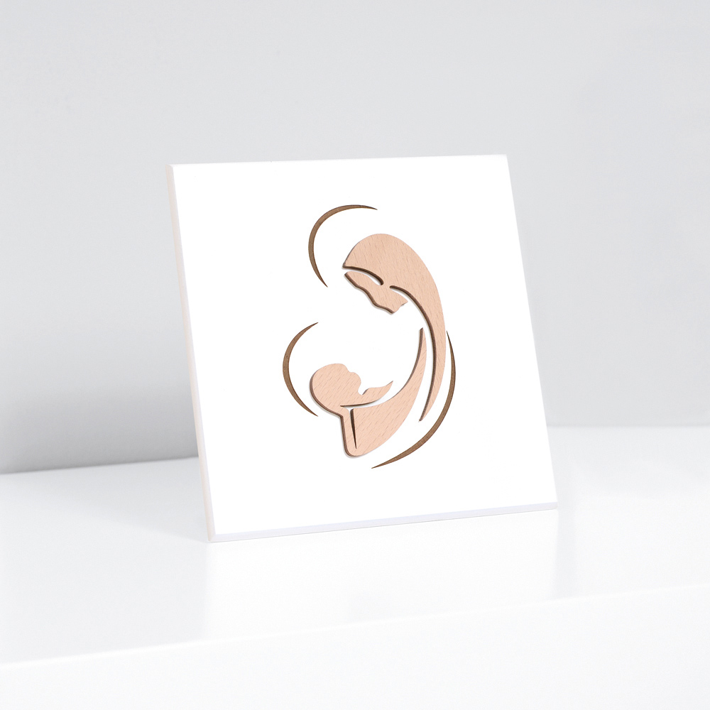 Posvátný obraz se stylizovanou matkou a dítětem , aplikovaný v přírodním dřevě. Bílý lakovaný dřevěný panel s opěrnou nohou a otvorem pro zavěšení na zeď.