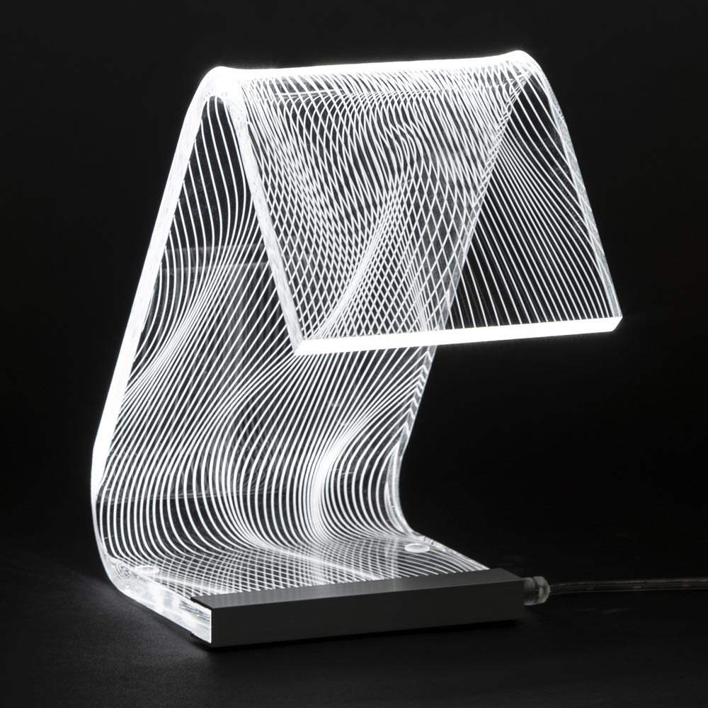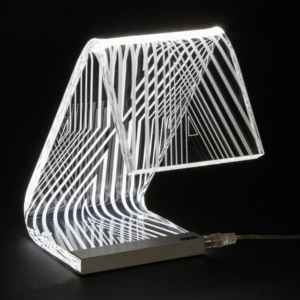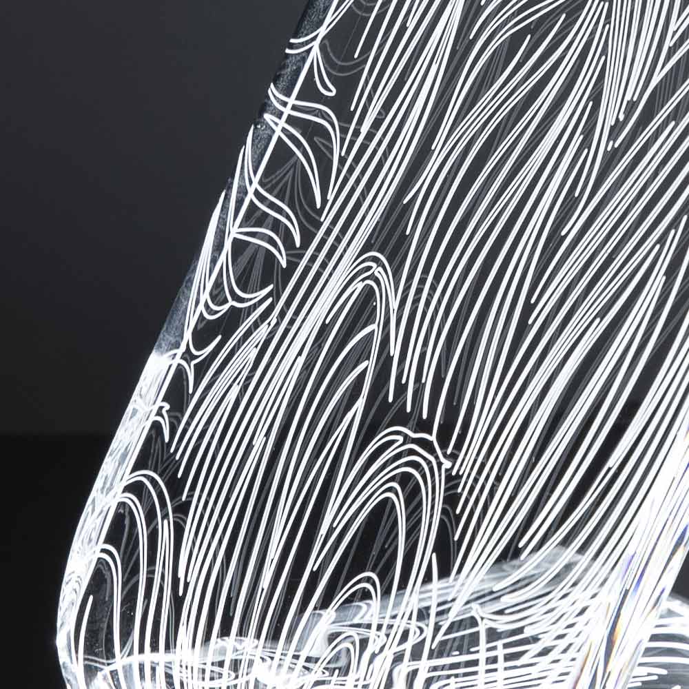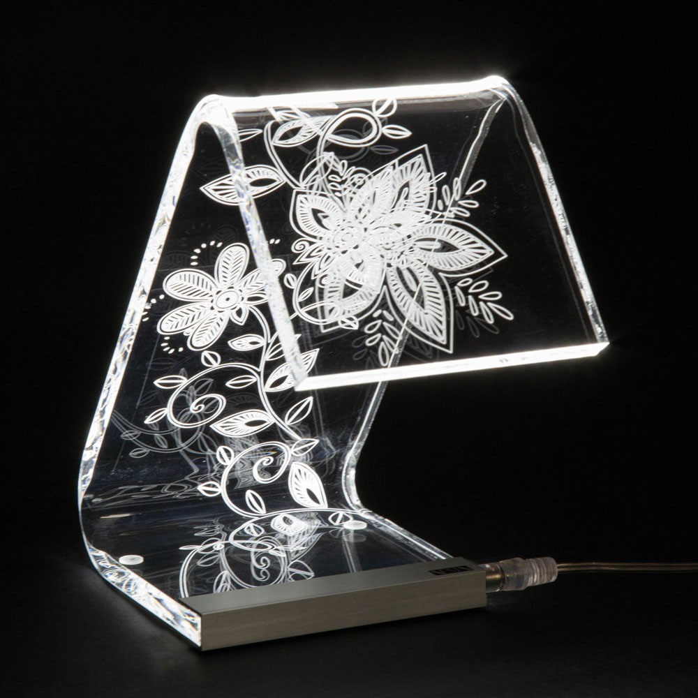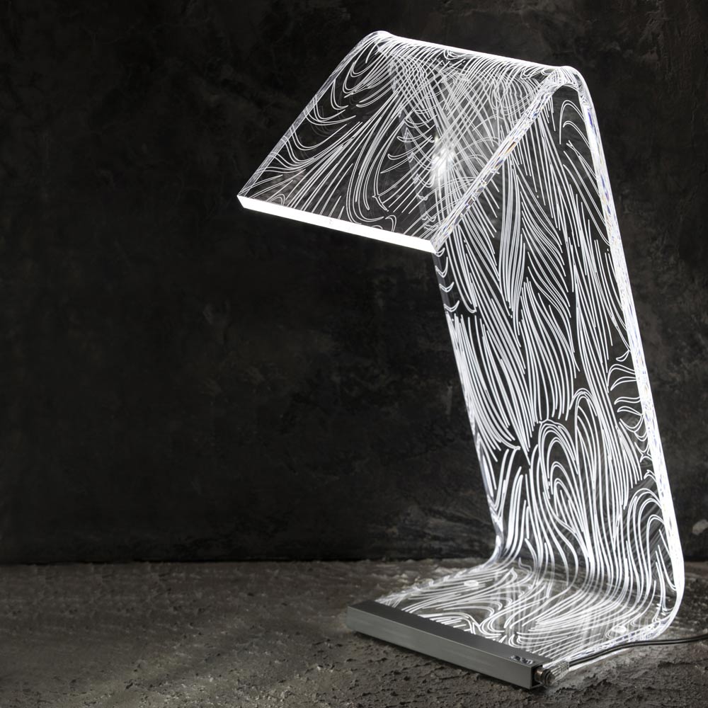 Stolní lampa z průhledného akrylového krystalu s laserovými dekoracemi, 2 velikosti vyrobené v Itálii.