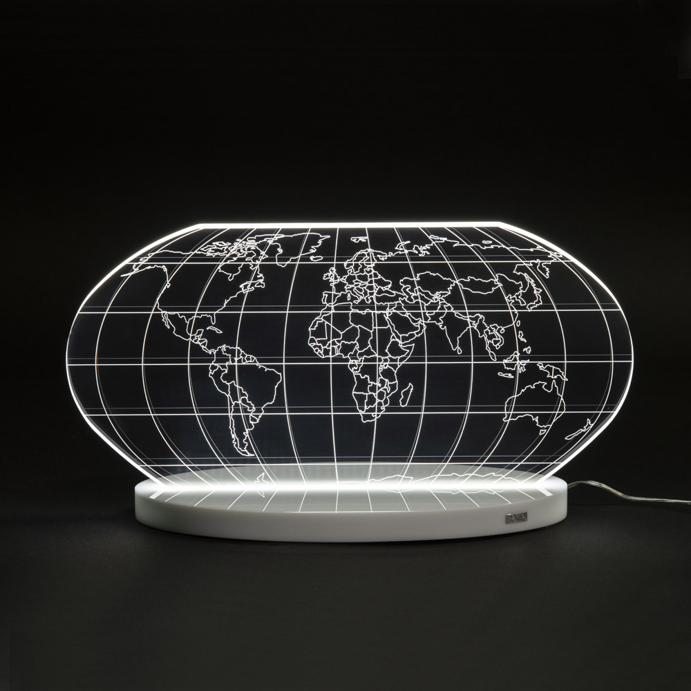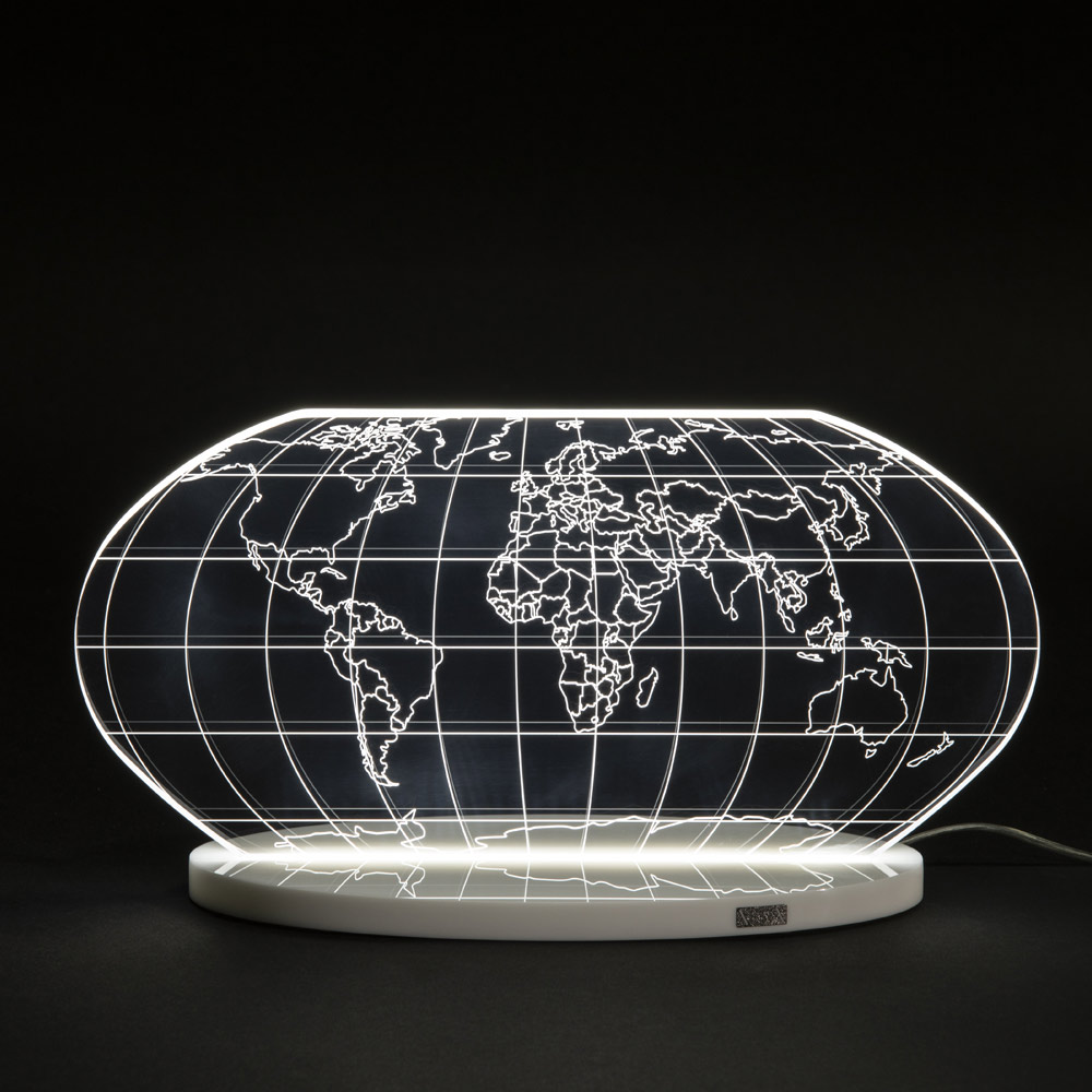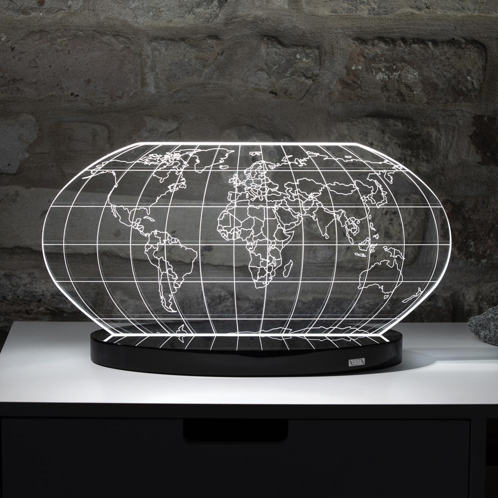 Stolní lampa z průhledného akrylového krystalu a laserem gravírované mapy světa, 2 velikosti vyrobené v Itálii.