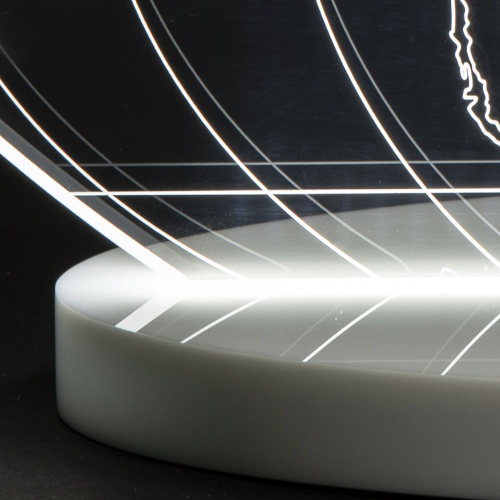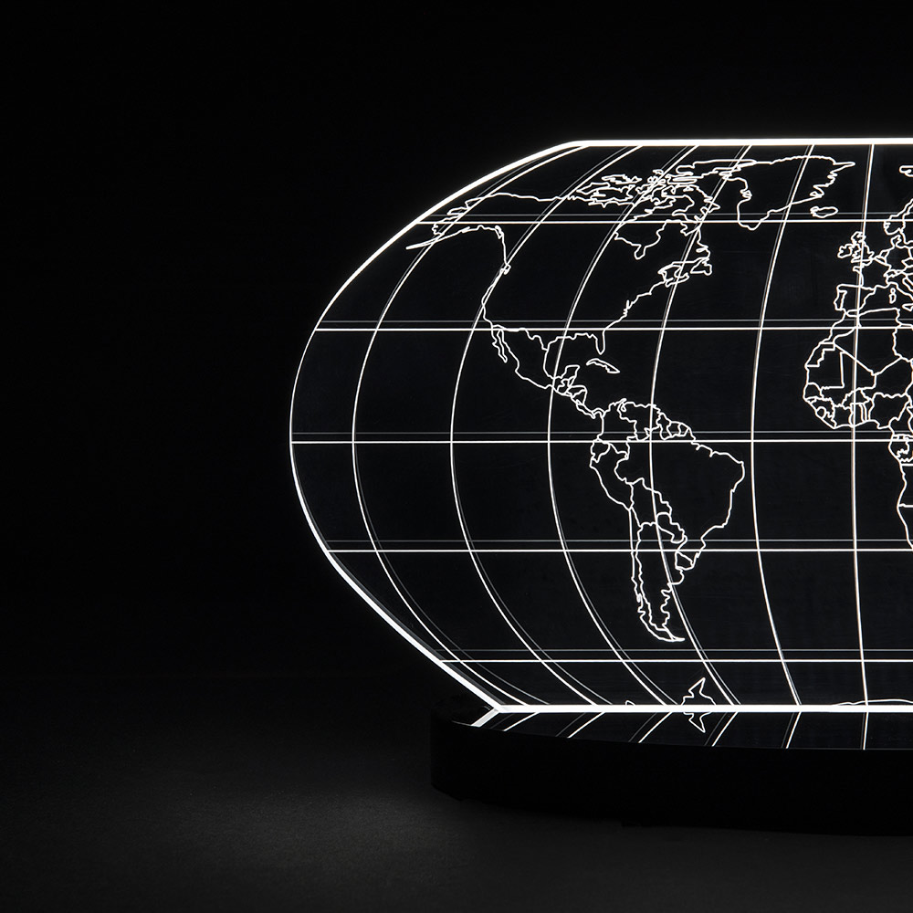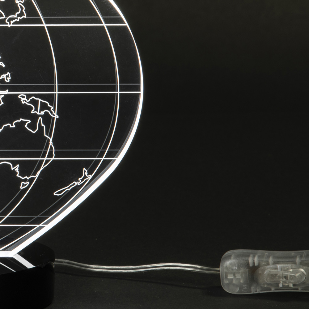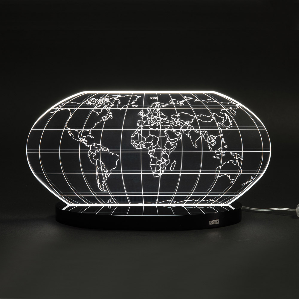 Stolní lampa z průhledného akrylového krystalu a laserem gravírované mapy světa, 2 velikosti vyrobené v Itálii.