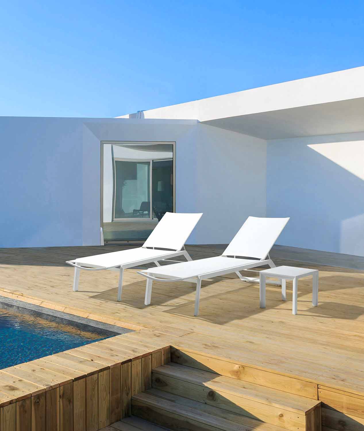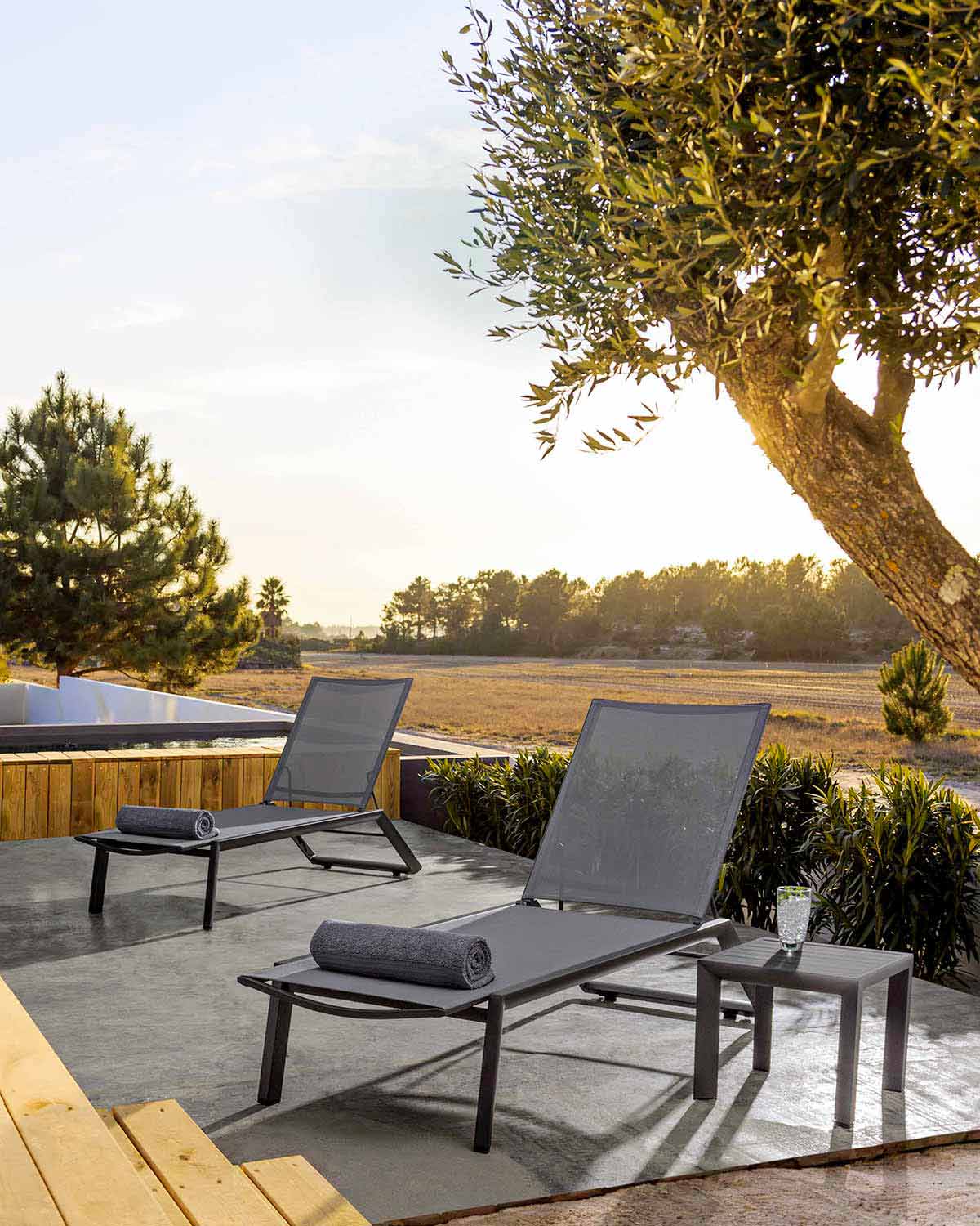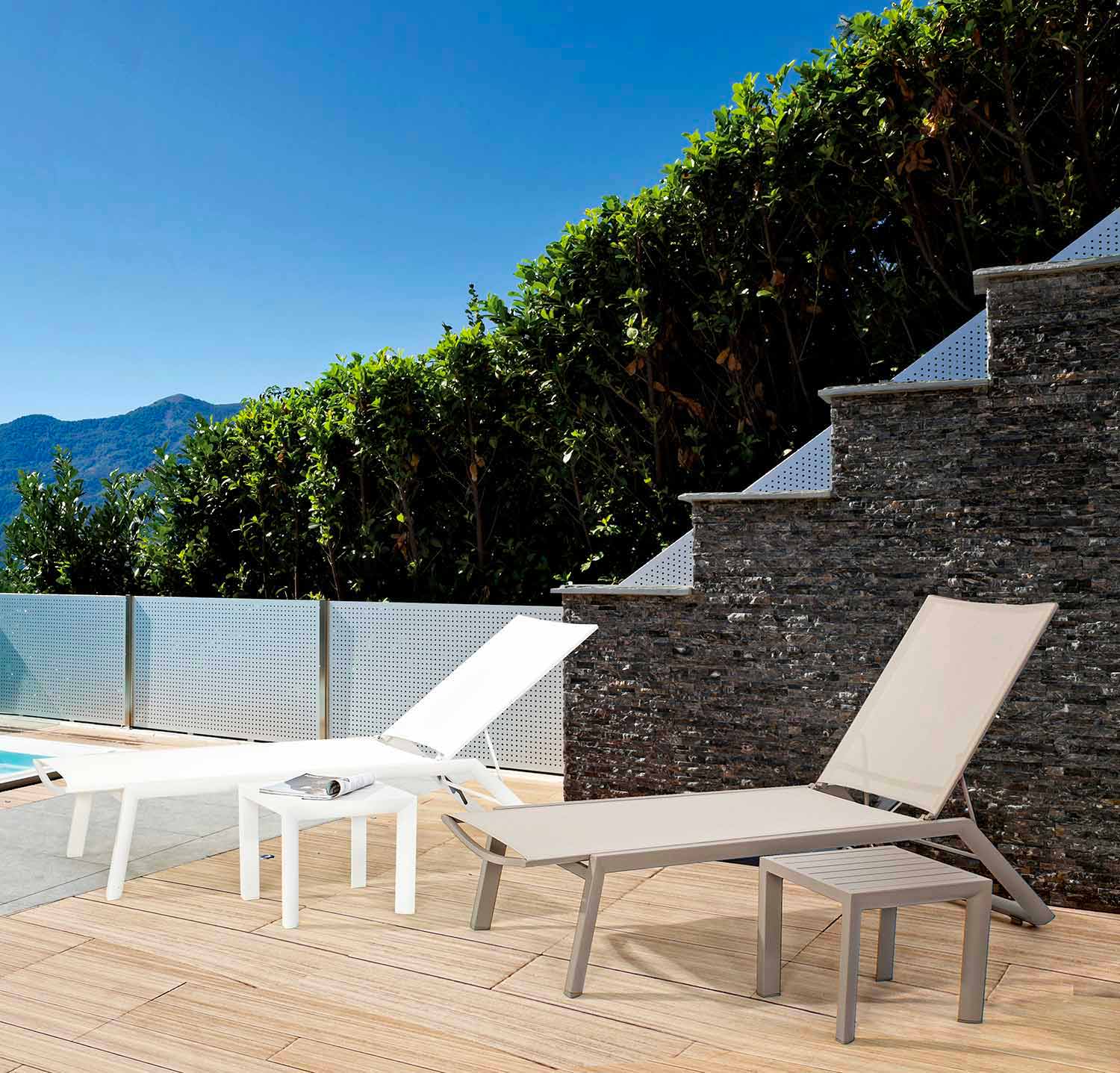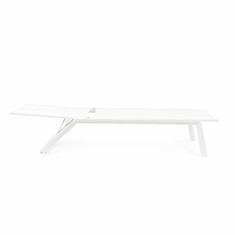 Zahradní postel s koly, sklápěcí s hliníkovou konstrukcí a sedákem z bílého nebo antracitového textilu.