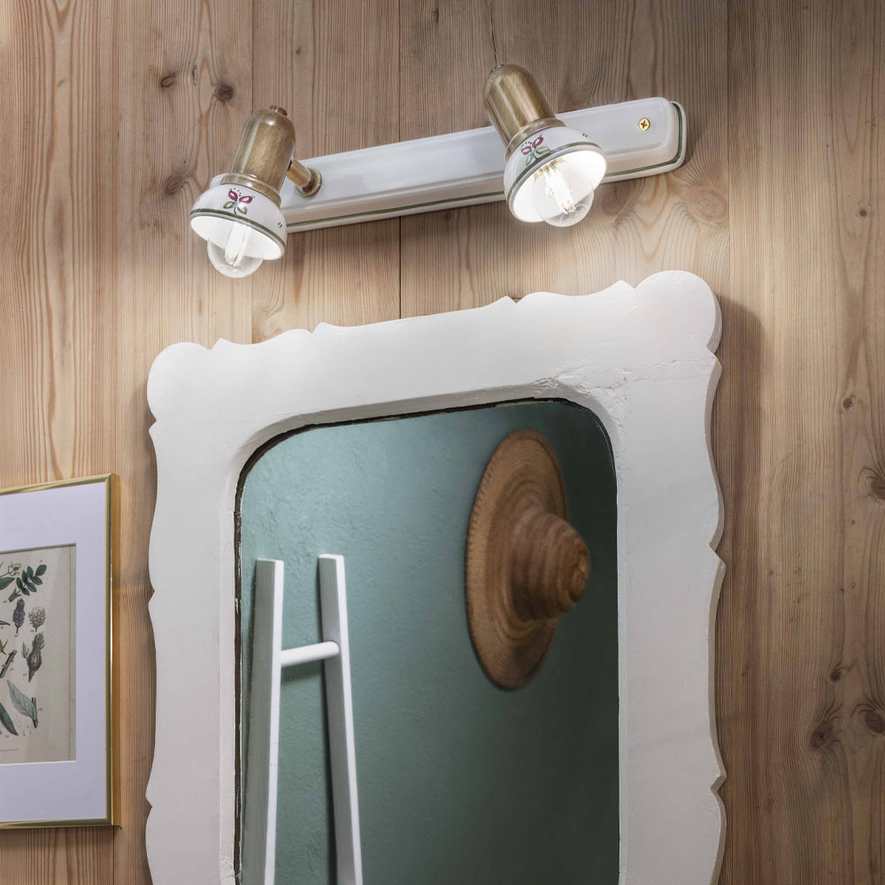 Lineární nástěnné svítidlo se 2 světly z mosazi a ručně malované keramiky, vyrobené v Itálii společností Ferroluce.