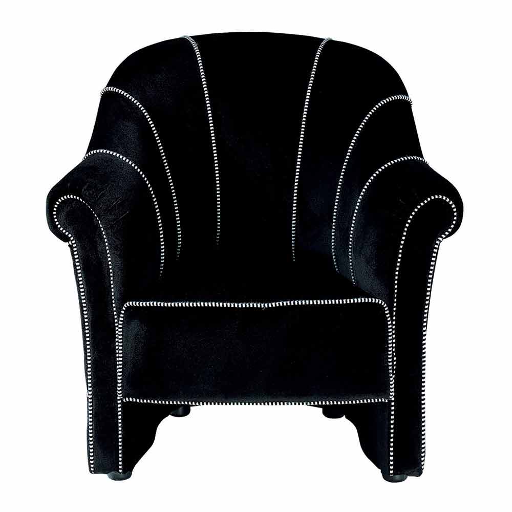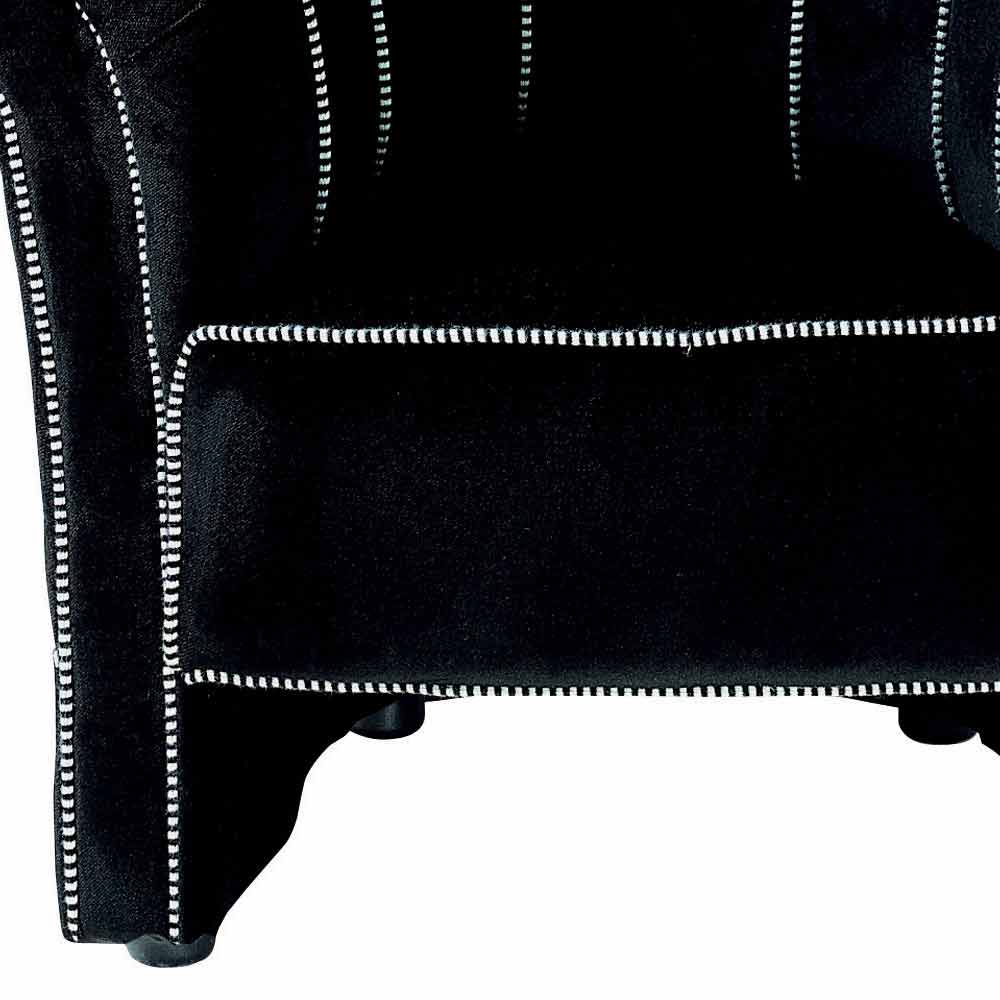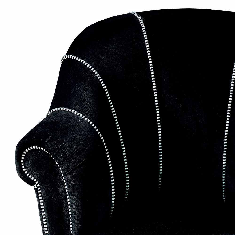 Křeslo do obývacího pokoje s vnitřní dřevěnou konstrukcí potaženou polyuretanovou pěnou a podšívkou z polyesterových vláken, vnější potah z černého sametu s černobílými ověsy ( neodnímatelné ). Toto křeslo je vyrobeno ze 100% produkce v Itálii a má obzvláště jednoduchý a univerzální tvar, který se díky střízlivému designu a základním tvarům snadno přizpůsobí jakémukoli modernímu obývacímu prostoru. Obohatením estetiky jsou kontrastní švy, které podtrhují základní rysy křesla a dávají pocit zdokonalení a inovace pro špičkový výsledek. Toto řešení je ideální pro ty, kteří milují elegantní styl zařizování, a navíc má sametový povlak, materiál, který maximalizuje své pohodlí i na dotek. Materiály zvolené a použité pro realizaci tohoto doplňku také umožňují získat obzvláště příjemné místo k sezení, proto ideální pro strávení nádherných chvil věnovaných relaxaci ve vašem obývacím pokoji.