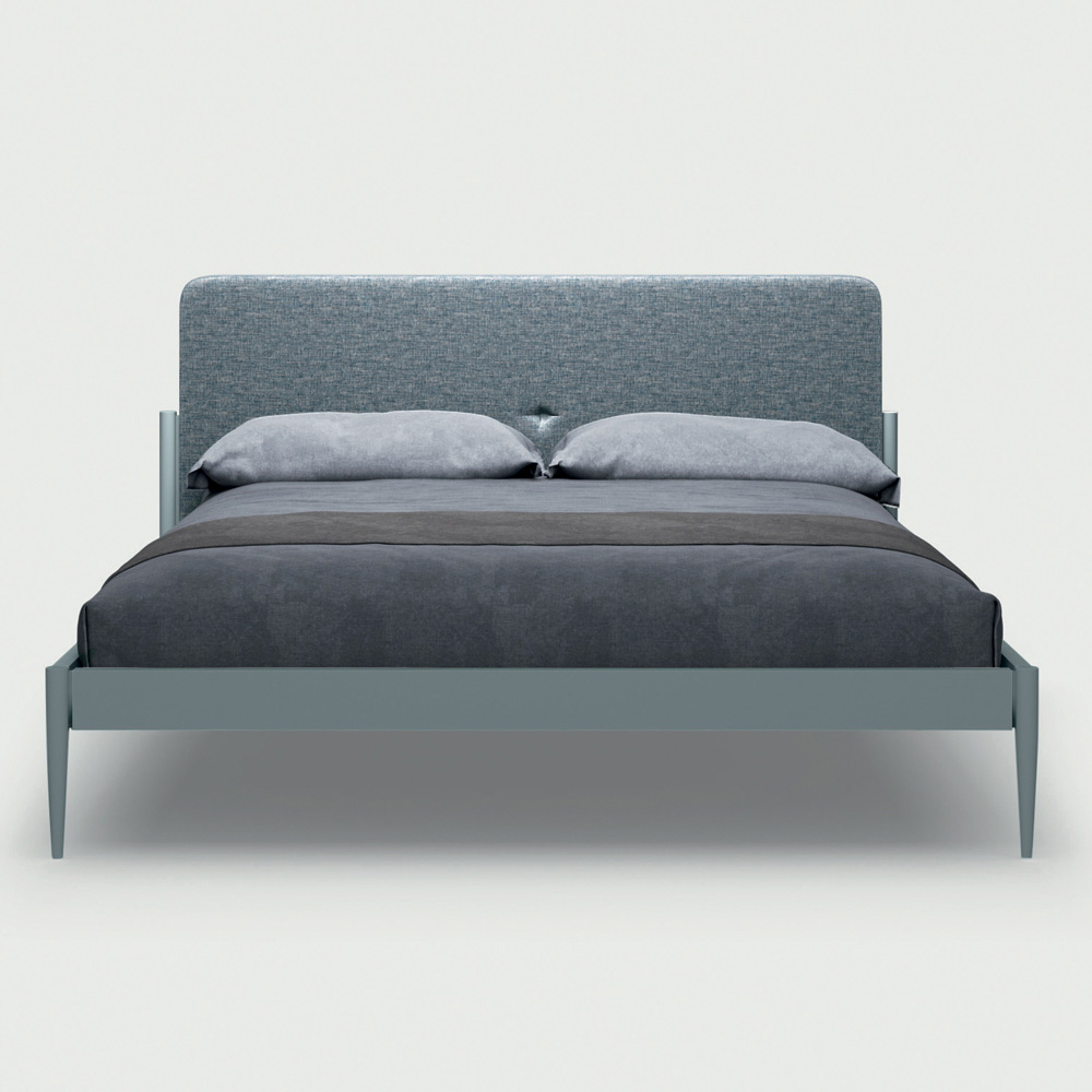 rámem postele a nohami z matně lakovaného dřeva v matné mlze a čelo postele potažené látkou, 2 noční stolky se 2 zásuvkami a komodu se 4 zásuvkami z matného titanového lakovaného dřeva potaženého