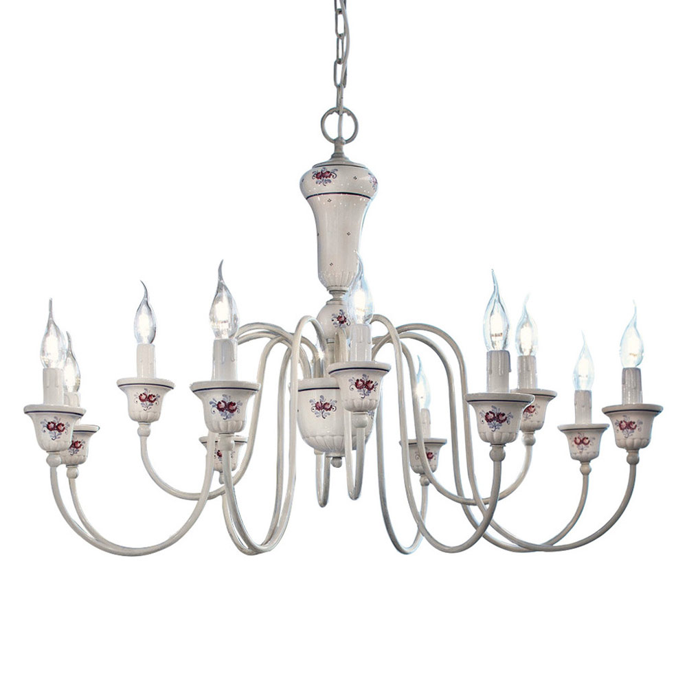 Ručně vyráběný 12lampový mosazný a ručně malovaný keramický lustr vyrobený v Itálii firmou Ferroluce.