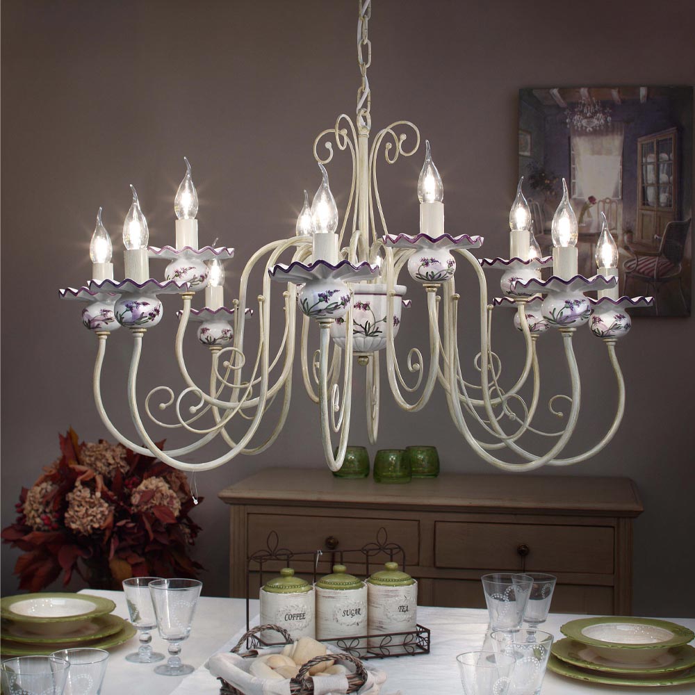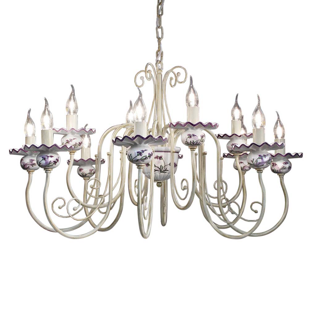 Ručně vyrobený 12 světelný lustr z mosazi a ručně malované keramiky, vyrobený v Itálii společností Ferroluce.