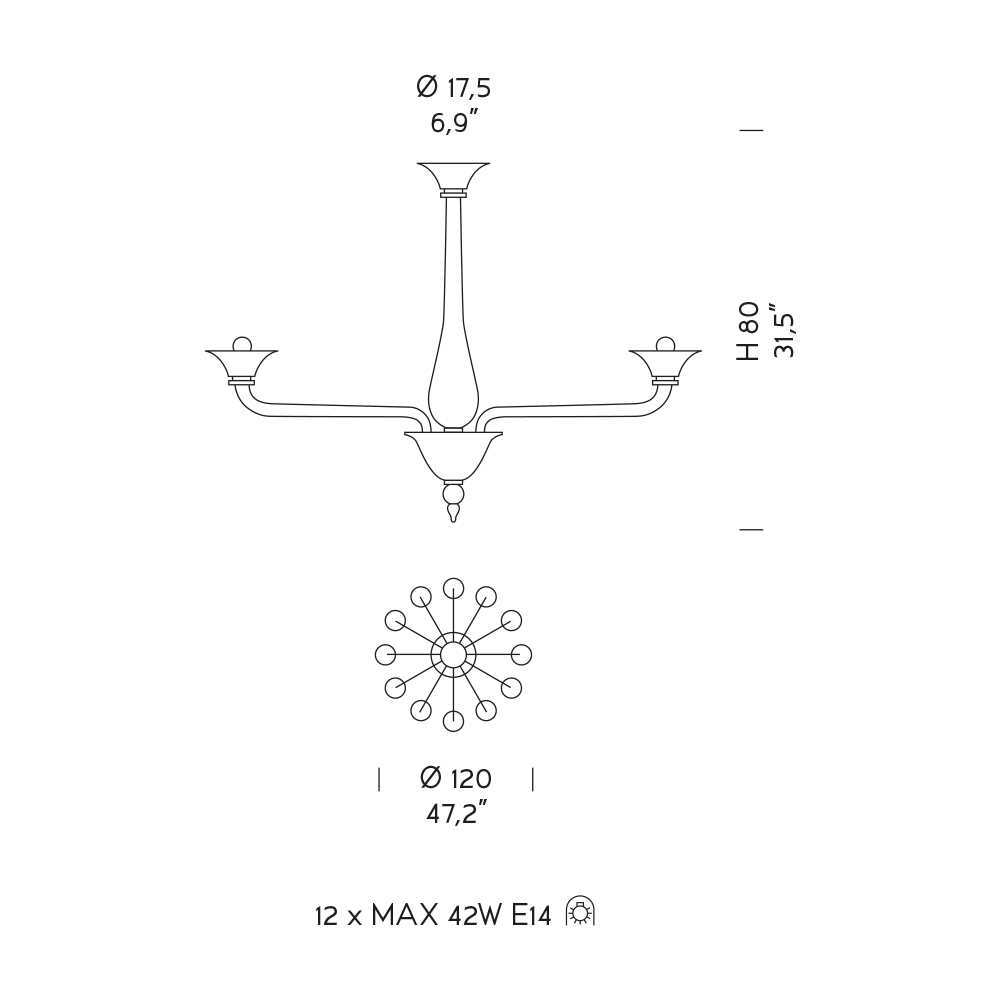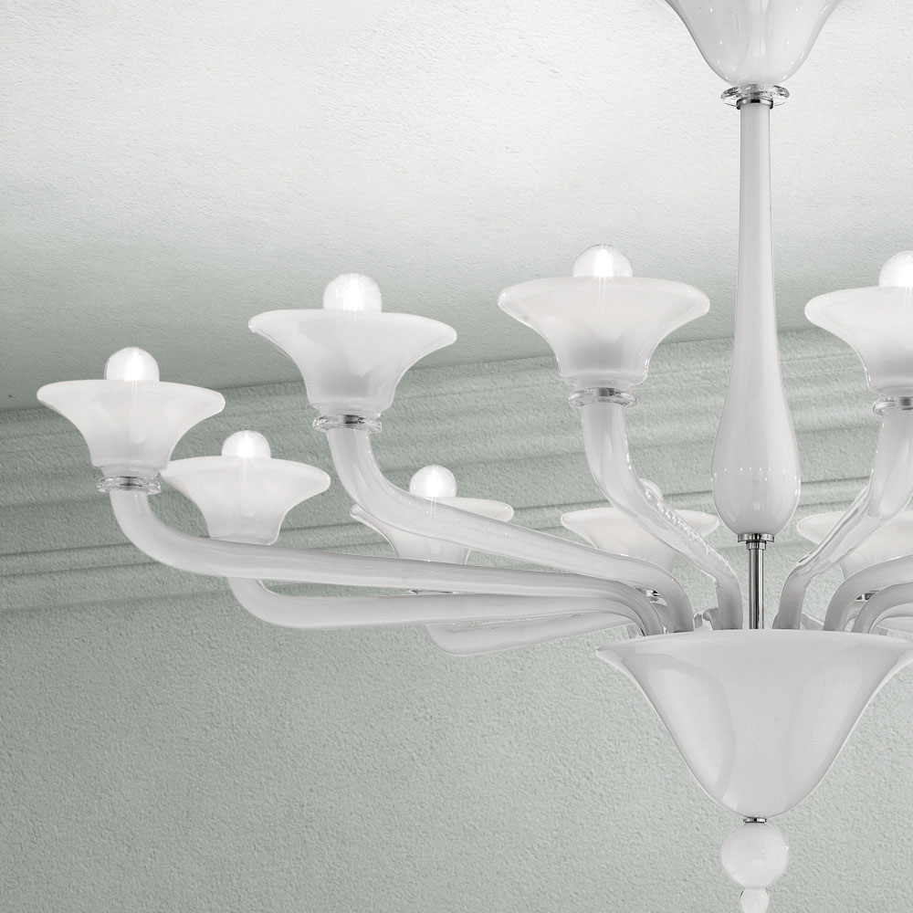 Lustr 12 světel z benátského skla s mléčnou bílou křišťálovou úpravou s kovovými detaily v lesklém chromovém provedení . Bezprecedentní setkání mezi historickými liniemi a současným designem , které dává život kusu nábytku s nadčasovým kouzlem a elegancí. Jeho estetika se vyznačuje členitým objemem , který se stává dynamickým a lehkým díky světelné vibraci úžasných foukaných skleněných ploch , které střídají elegantní průhledná ramena s poháry vyrobenými technikou obalování . Jeho hodnotu podtrhuje pozornost k detailu, která vychází z chromovaných kovových komponentů, které umožňují, aby se produkt přizpůsobil různým chutím a situacím použití.