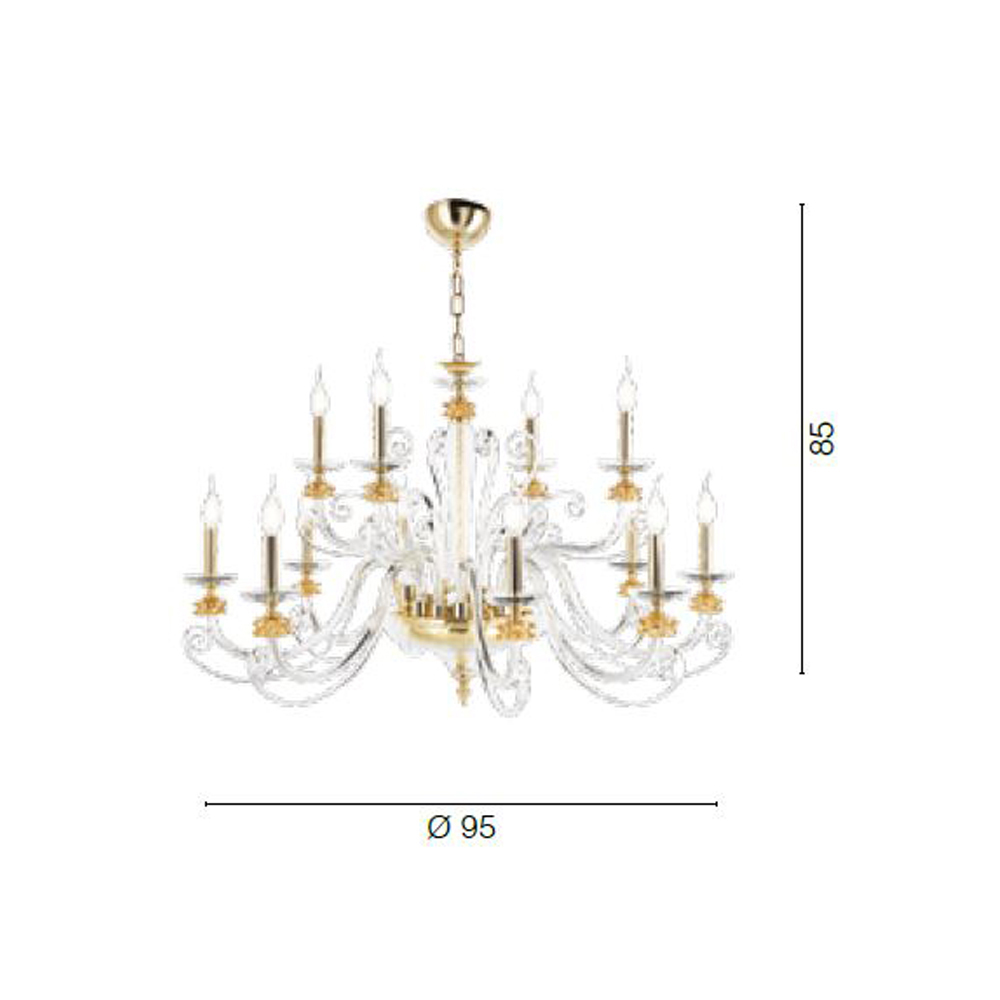 Ručně vyráběný 12 světelný lustr z foukaného skla a optického krystalu, luxusní vyrobený v Itálii.