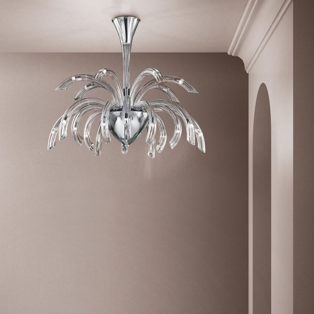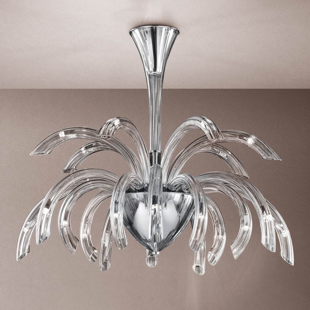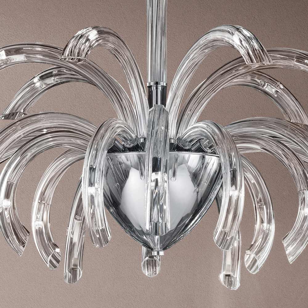 Lustr s 21 světly z ručně vyráběného benátského skla s křišťálovou úpravou a obohacený o detaily v chromovaném kovu . Poutavá estetika, která se díky svým tvarům a funkčnosti designu přizpůsobí jakémukoli typu prostředí, do kterého se s nadšením hodí. Nádherná a elegantní zakřivená ramena se roztahují směrem ven, aby přinášela světlo různými směry a osvětlovala místnost originálním scénografickým efektem , který připomíná explozi ohňostrojů pro kreativní , rafinovaný a silný vizuální efekt .