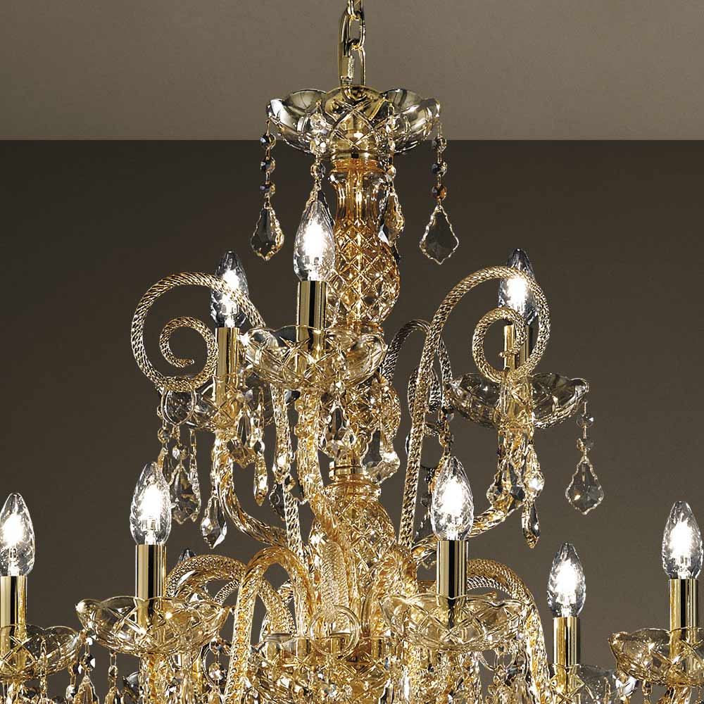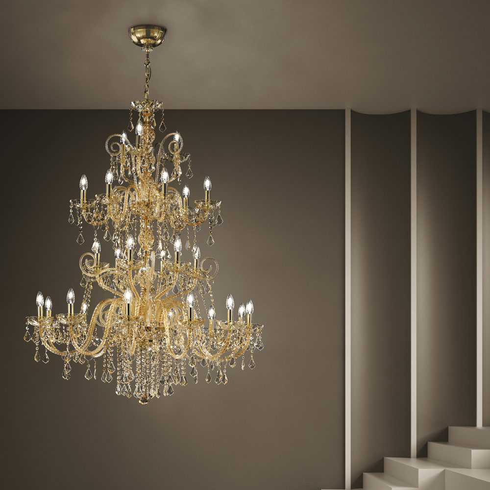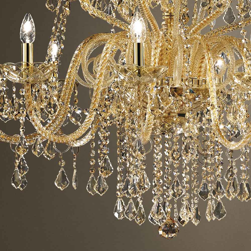 Lustr s 27 světly z benátského skla s dekorem Amber s národními přívěsky a detaily v lesklém zlatém kovu . Tento doplněk, vyrobený řemeslnou zručností , se vyznačuje nádhernými pažemi zpracovanými ručně pomocí techniky kroucení, která vytváří exkluzivní výsledek, který esteticky připomíná propletení lana a dodává lustru osobitost. Opravdový déšť světla proniká do konstrukce lustru a následně se pomocí lomu šíří do okolního prostředí kouzlem flitrů a křišťálových přívěsků s jemnými povrchovými úpravami, čímž vytváří evokující a snový scénografický efekt schopný okouzlit a překvapit. pro jeho eleganci a majestátnost .