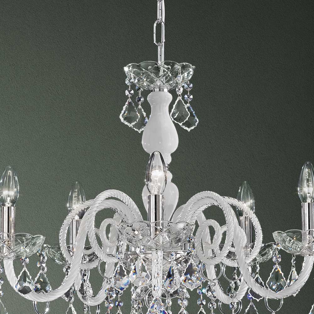 Lustr z benátského skla s mléčně bílou povrchovou úpravou s olověnými přívěsky a detaily z leštěného chromovaného kovu . Tento doplněk, vyrobený řemeslnou zručností , se vyznačuje nádhernými pažemi zpracovanými ručně pomocí techniky kroucení, která vytváří exkluzivní výsledek, který esteticky připomíná propletení lana a dodává lustru osobitost. Skutečný déšť světla proniká do konstrukce lustru a poté se pomocí lomu šíří do okolního prostředí magií flitrů a křišťálových přívěsků s jemnými povrchovými úpravami, čímž vytváří evokující a snový scénografický efekt schopný okouzlit a překvapit. pro jeho eleganci a majestátnost .