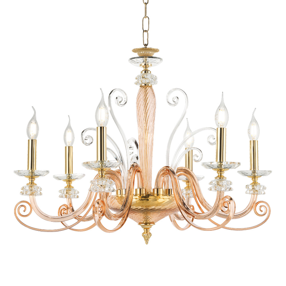 Ručně vyráběný 6 světelný lustr z foukaného skla a optického krystalu, luxusní vyrobený v Itálii.