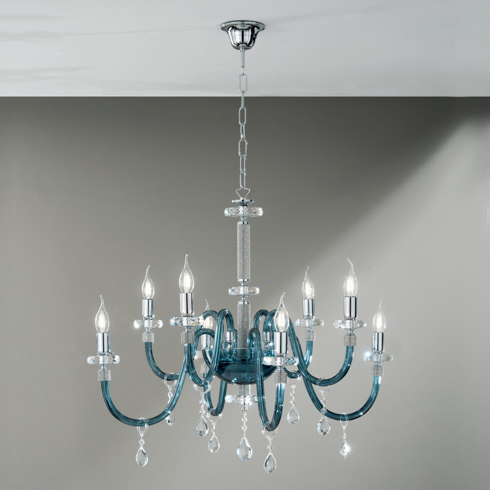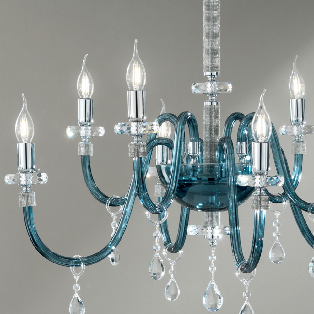 Tento závěsný lustr v klasickém stylu se skládá z 8 obloukových ramen vyrobených z ručně vyráběného skla v italské zelenomodré s efektem "rigaton", jehož konec je obklopen třpytkami zasazenými do kovu, stejně jako střední část doplňku. , kde dva trubkové kruhové disky podpírají strukturu proloženou dvěma kruhovými disky různých velikostí z broušeného křišťálu.