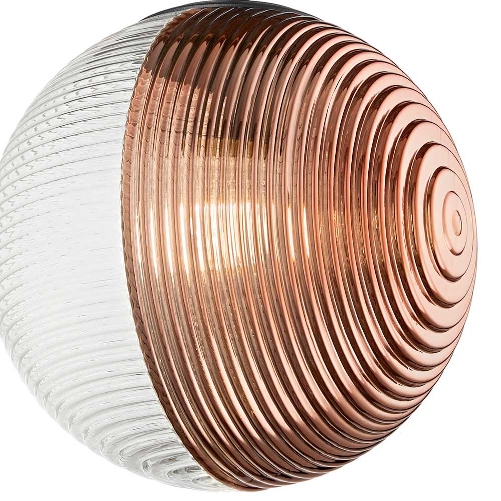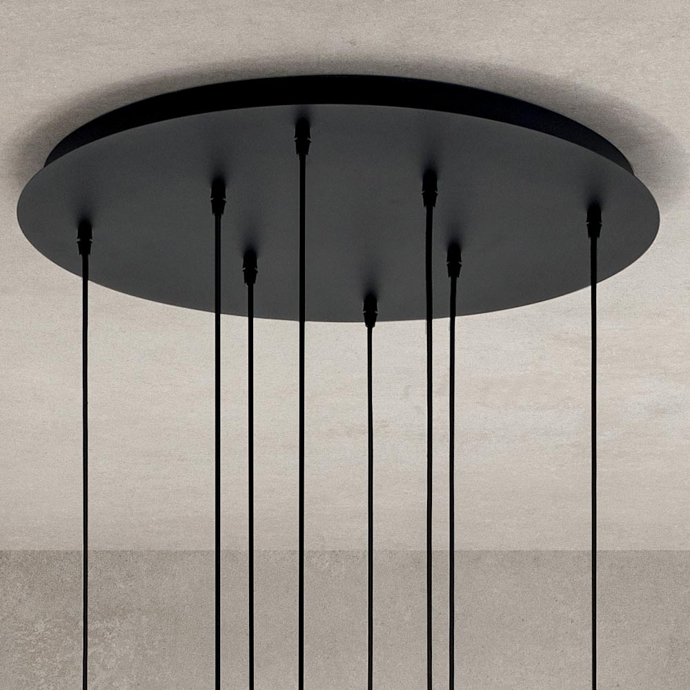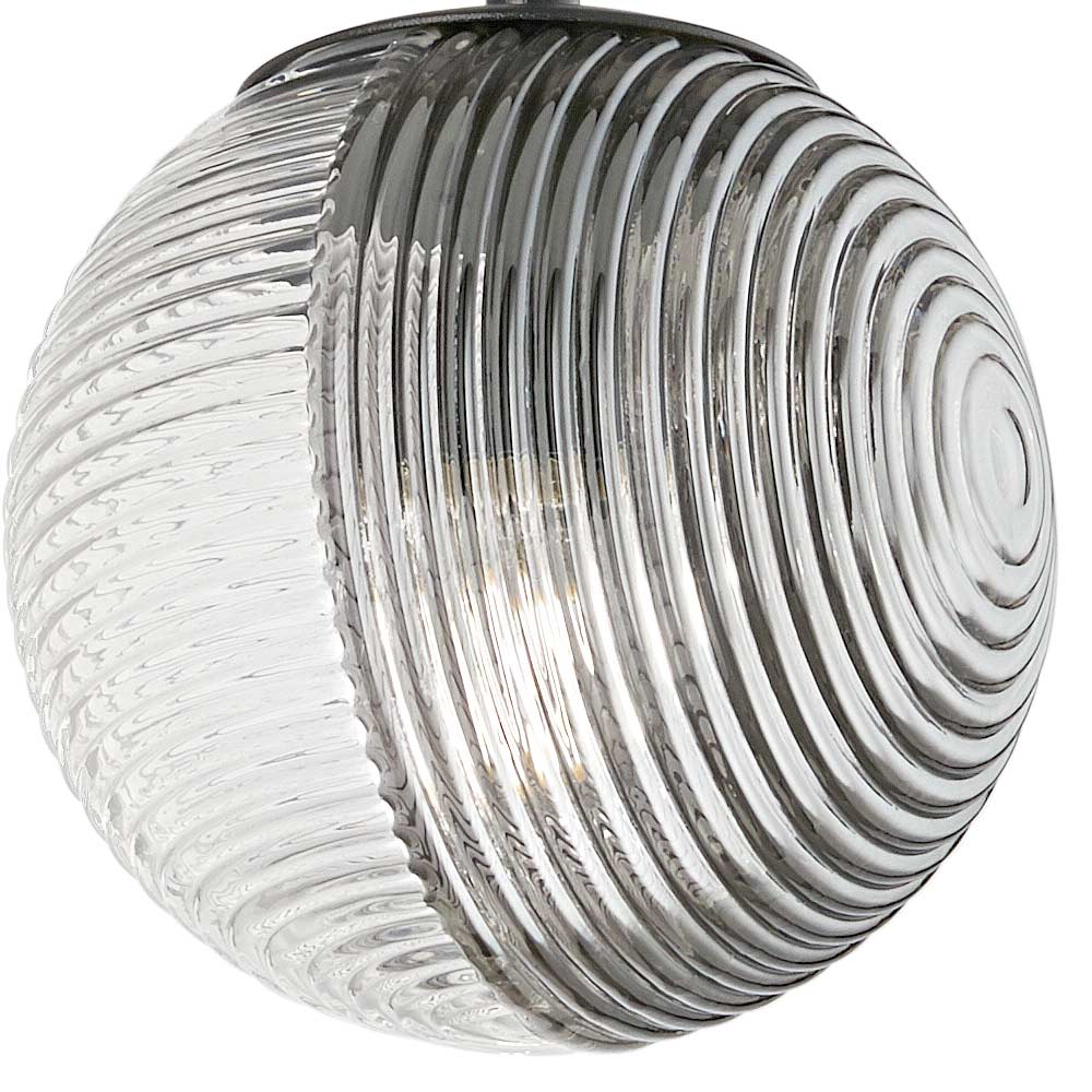 Lustr z foukaného skla kulovitého tvaru s polokulovou linií rozdělenou na dvě části: jednu průhlednou a jednu barevnou. Rám z matně černého lakovaného kovu a podhled ve stropě z černého kovu . Nastavitelné kabely o maximální délce 250 cm.