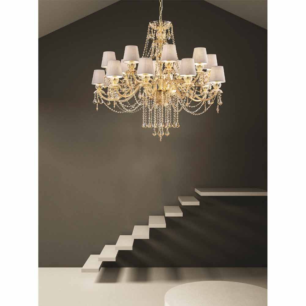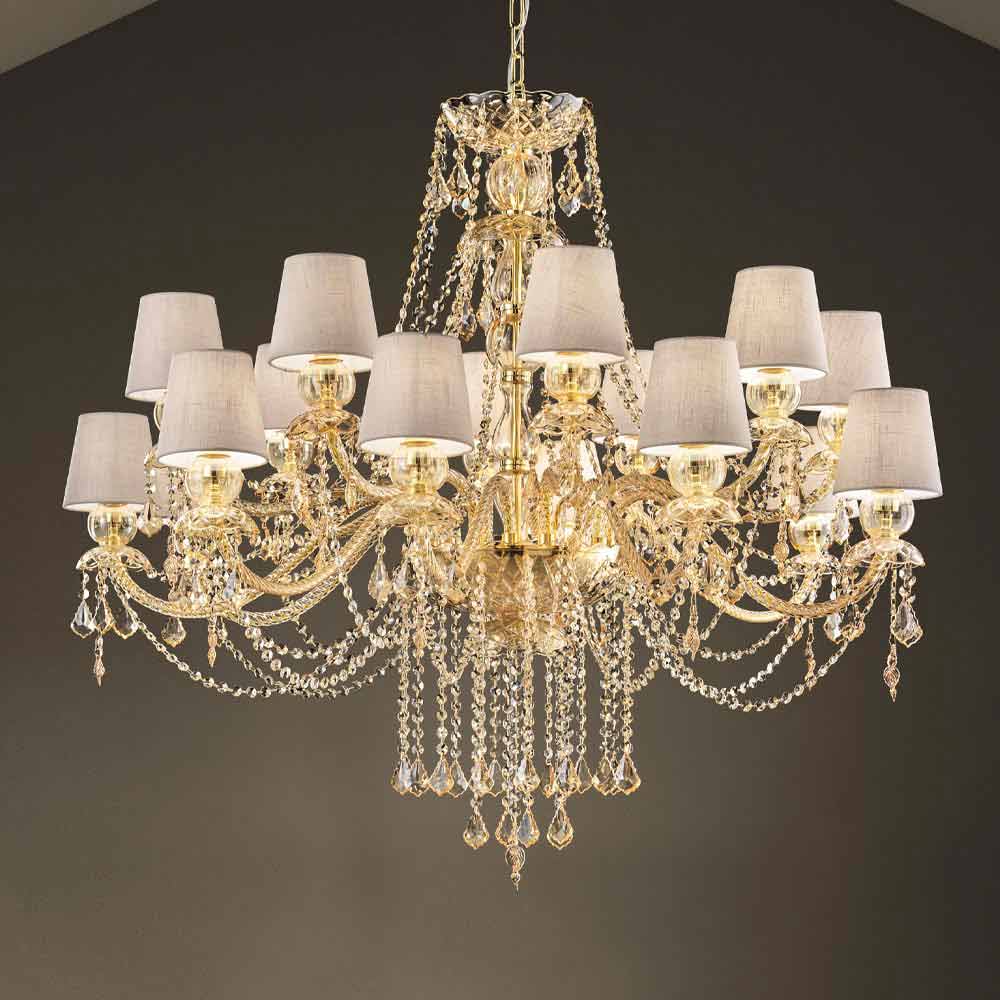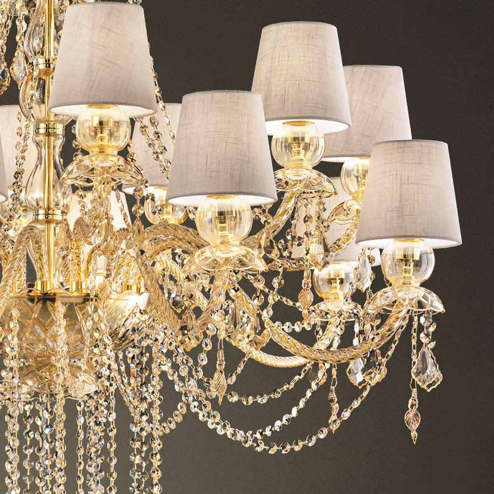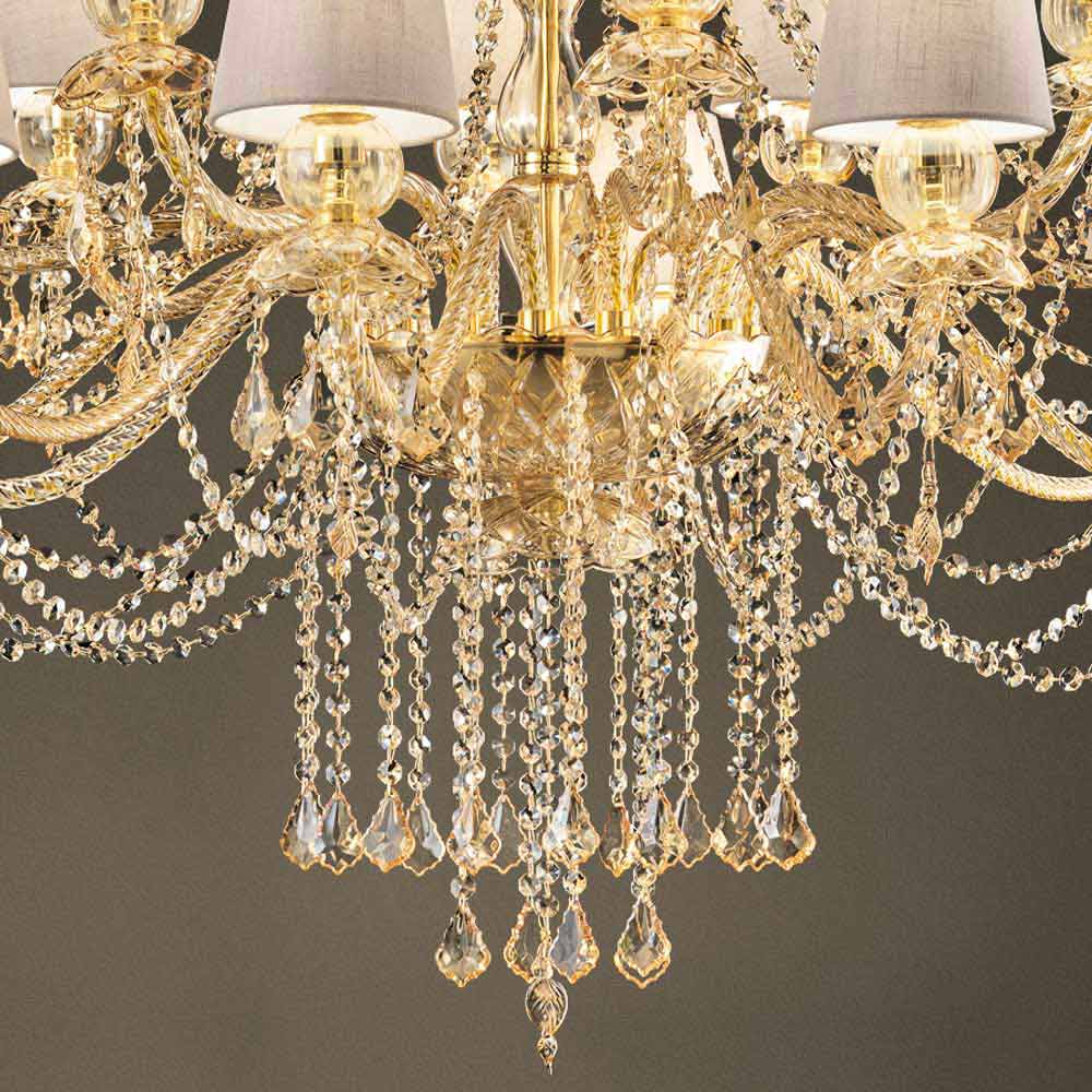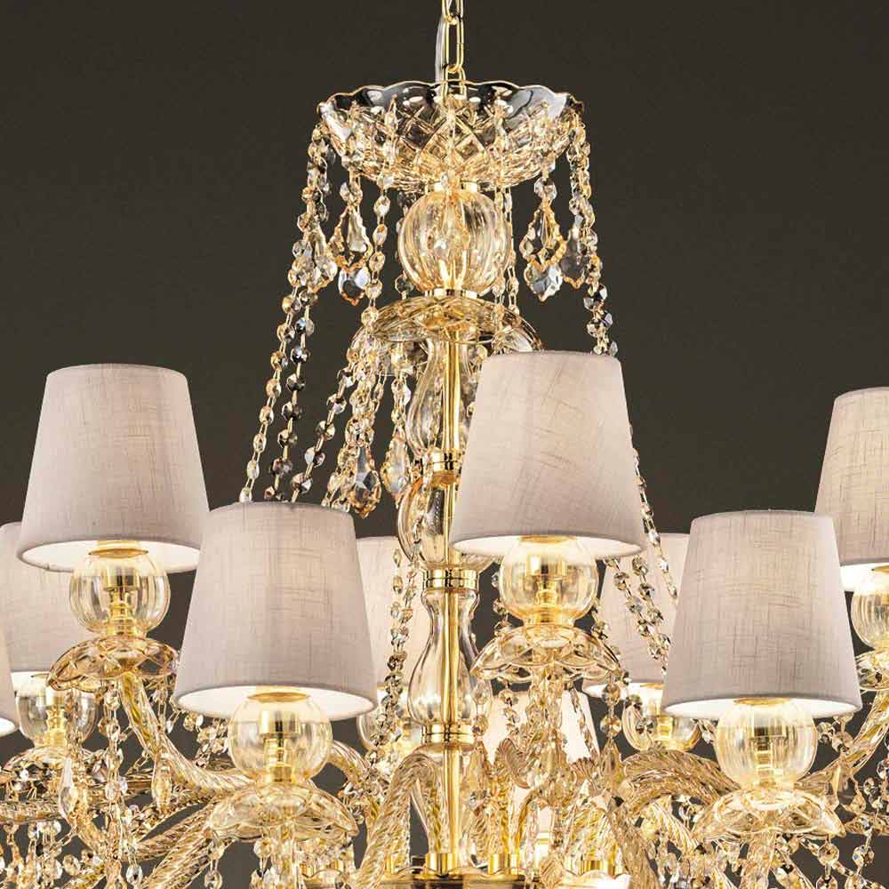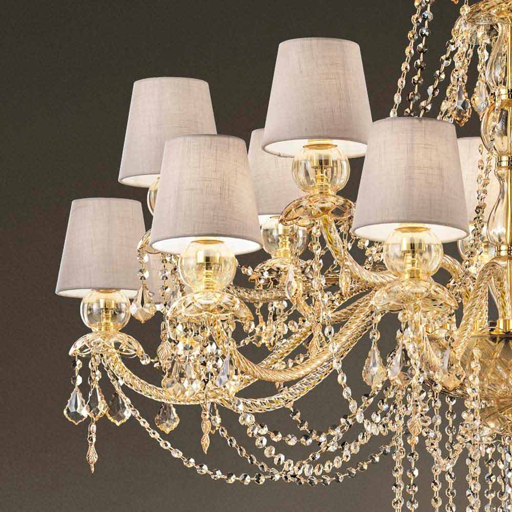 Rafinovaný lustr s jantarovou barvou benátského skla obohacený o prvky v křišťálovém provedení, 16 lněných stínidel a lesklé zlaté kovové detaily, ručně vyráběné v Itálii . Svítící přívěsky a fascinující stínítka představují zvláštnosti tohoto nádherného bytového doplňku s romantickou duší, která dokáže naplnit velké pokoje osobností a stylem s nadčasovou elegancí . Jeho estetika je jedinečná a zajímavá mnoha flitry, které prostřednictvím lomu světla vytvářejí barevné paprsky světla a sofistikovanou hru světla a stínu pro lustr se silným scénografickým dopadem .