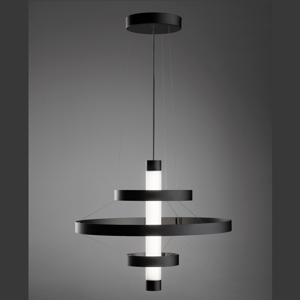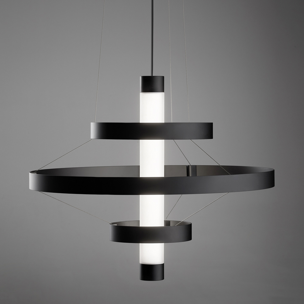 Vnitřní lustr s centrálním skleněným tělesem, které je středem světla a energie, a kolem kterého je uspořádána řada hliníkových prstenců různých velikostí, které působí dojmem, že jsou zavěšeny v prostoru.