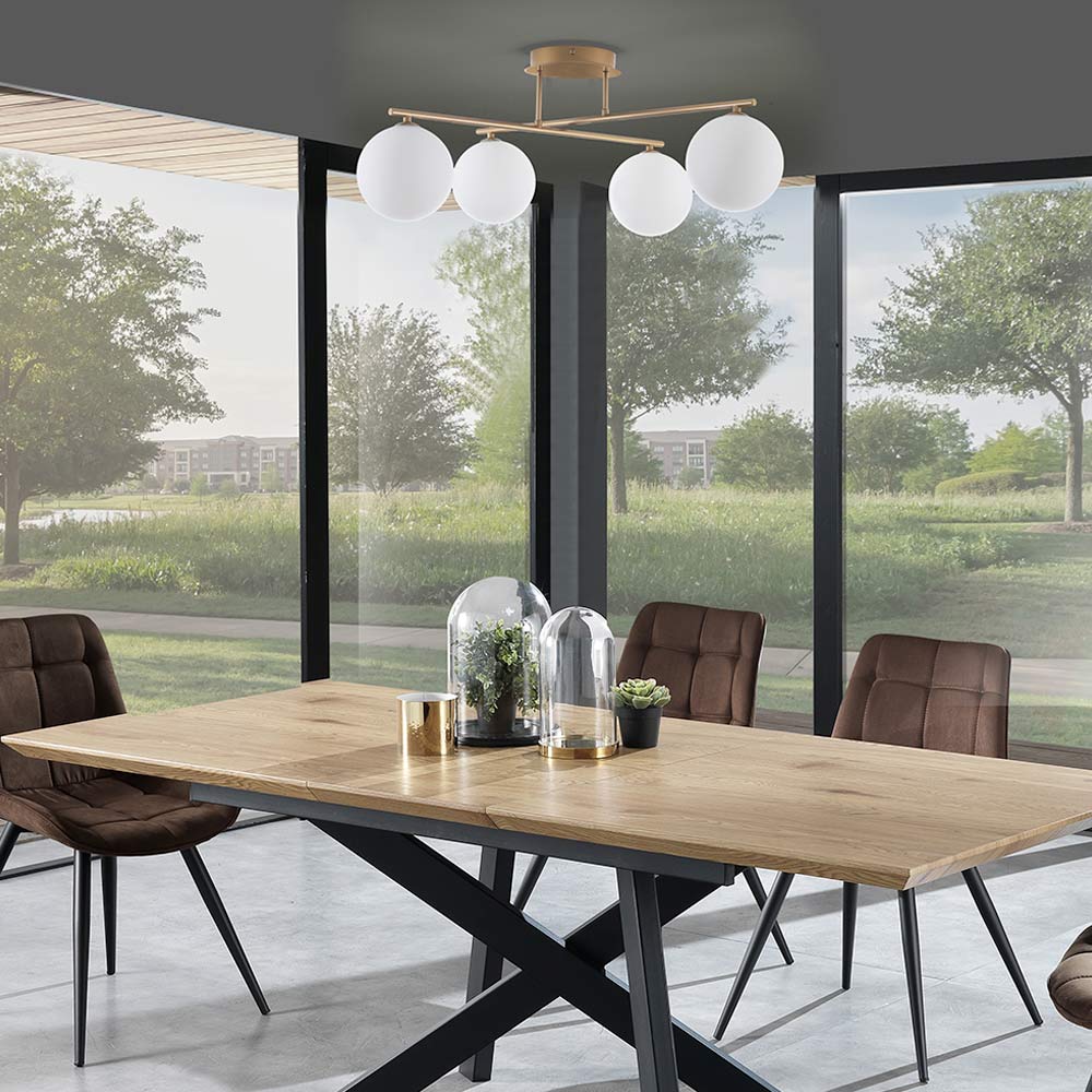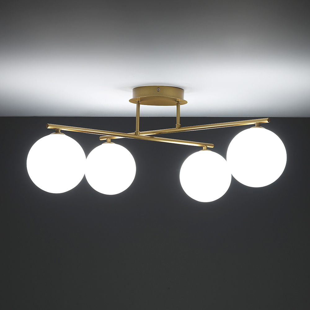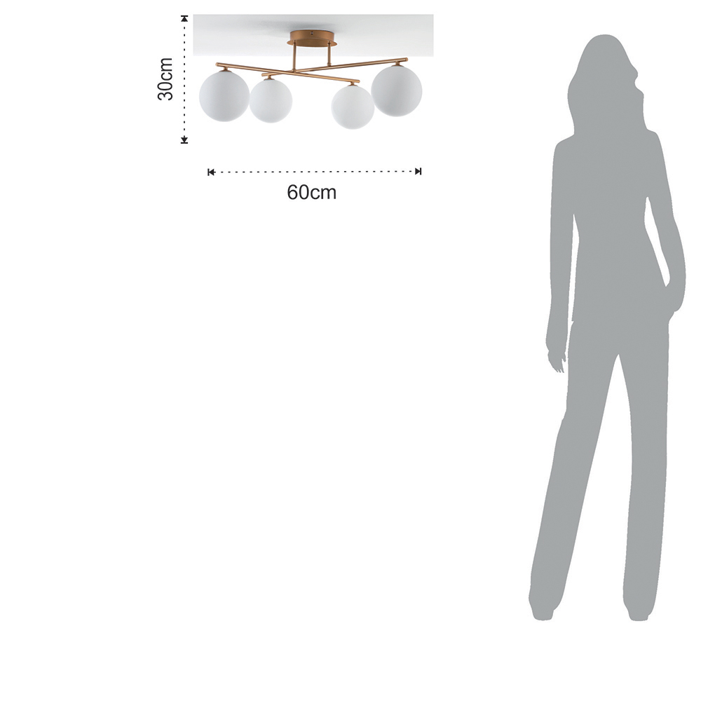 Tento lustr představuje vynikající příklad elegantního a moderního designu , ideální pro přidání stylu a kultivovanosti do jakéhokoli prostředí. Se čtyřmi neprůhlednými skleněnými koulemi zavěšenými na kovové konstrukci vytváří tento lustr rozptýlené a příjemné osvětlení, ideální pro prostředí, jako je jídelna, obývací pokoj nebo dokonce vstupní hala.
