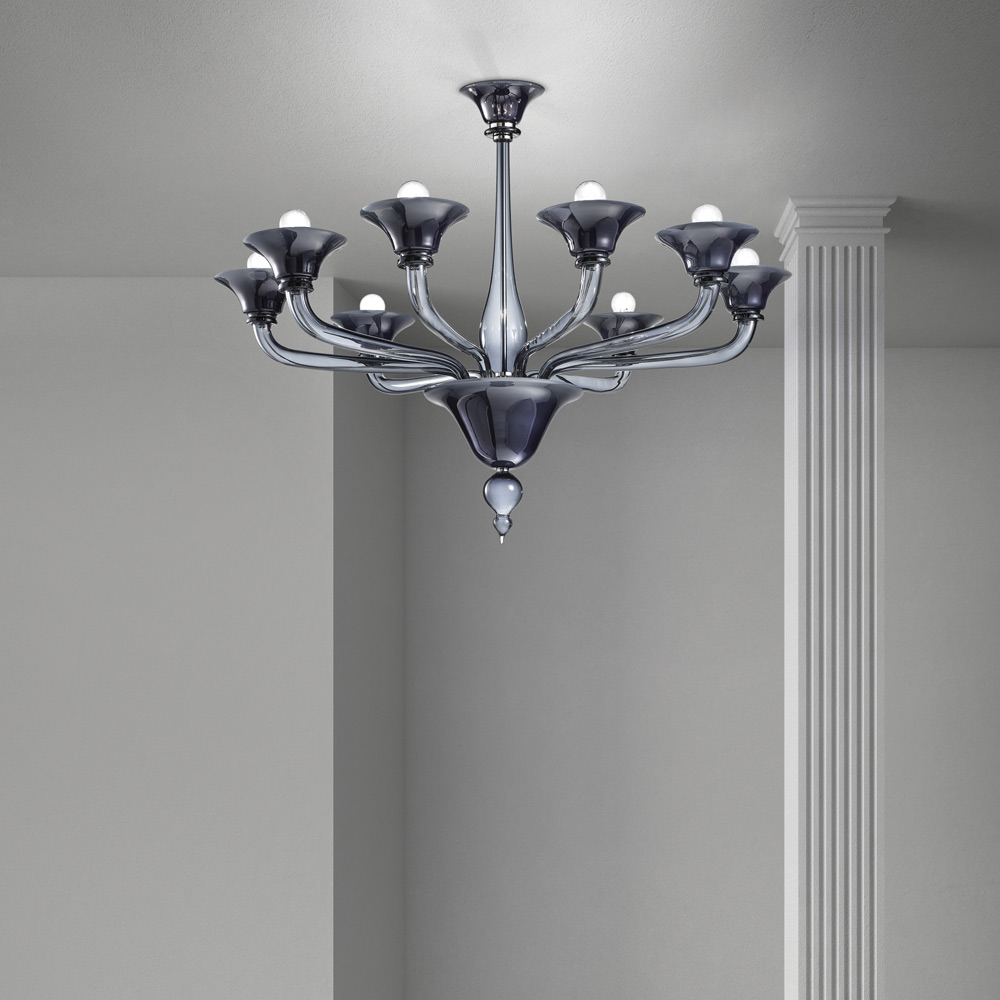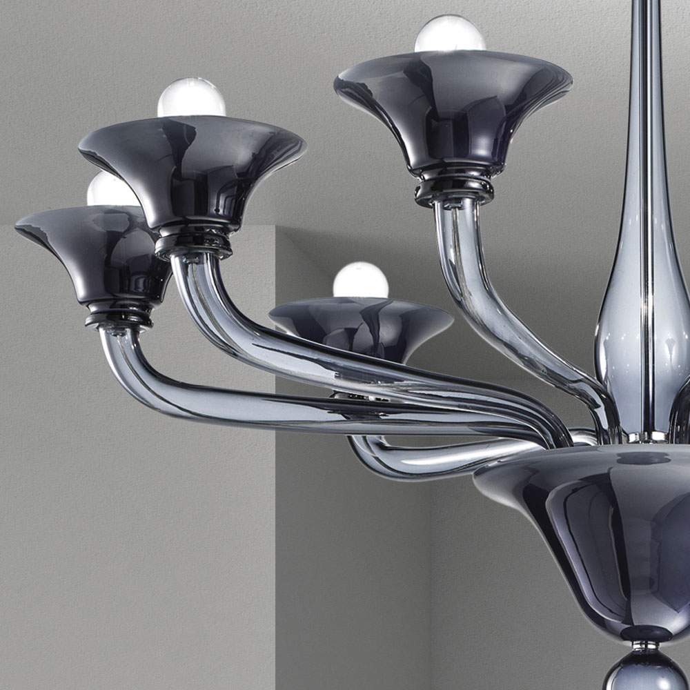 Lustr ručně vyrobený v Itálii z benátského skla s mléčně bílo-šedým povrchem s kovovými detaily v leštěném chromu . Bezprecedentní setkání mezi historickými liniemi a současným designem , které dává život kusu nábytku s nadčasovým kouzlem a elegancí. Jeho estetika se vyznačuje členitým objemem , který se stává dynamickým a lehkým díky světelné vibraci úžasných foukaných skleněných ploch , které střídají elegantní průhledná ramena s poháry vyrobenými technikou obalování . Jeho hodnotu podtrhuje pozornost k detailu, která vychází z chromovaných kovových komponentů, které umožňují, aby se produkt přizpůsobil různým chutím a situacím použití.
