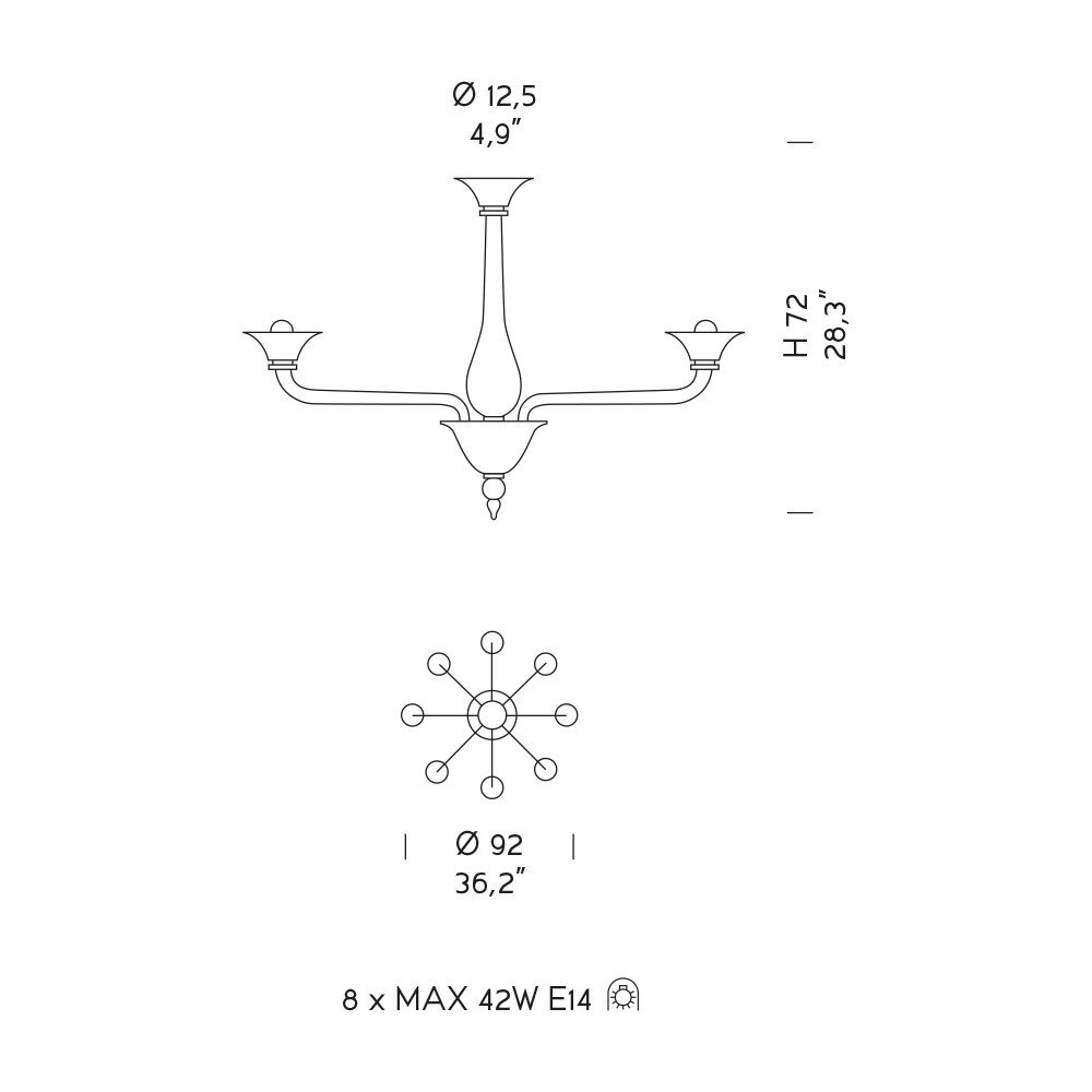 Žárovky (nejsou součástí balení) : 8 x MAX 42W E14