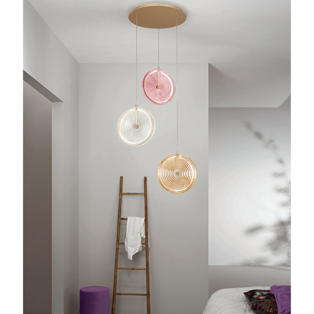zlaceného lakovaného kovu, sklo zdobené soustředným jantarem, růžovými a průhlednými linkami se