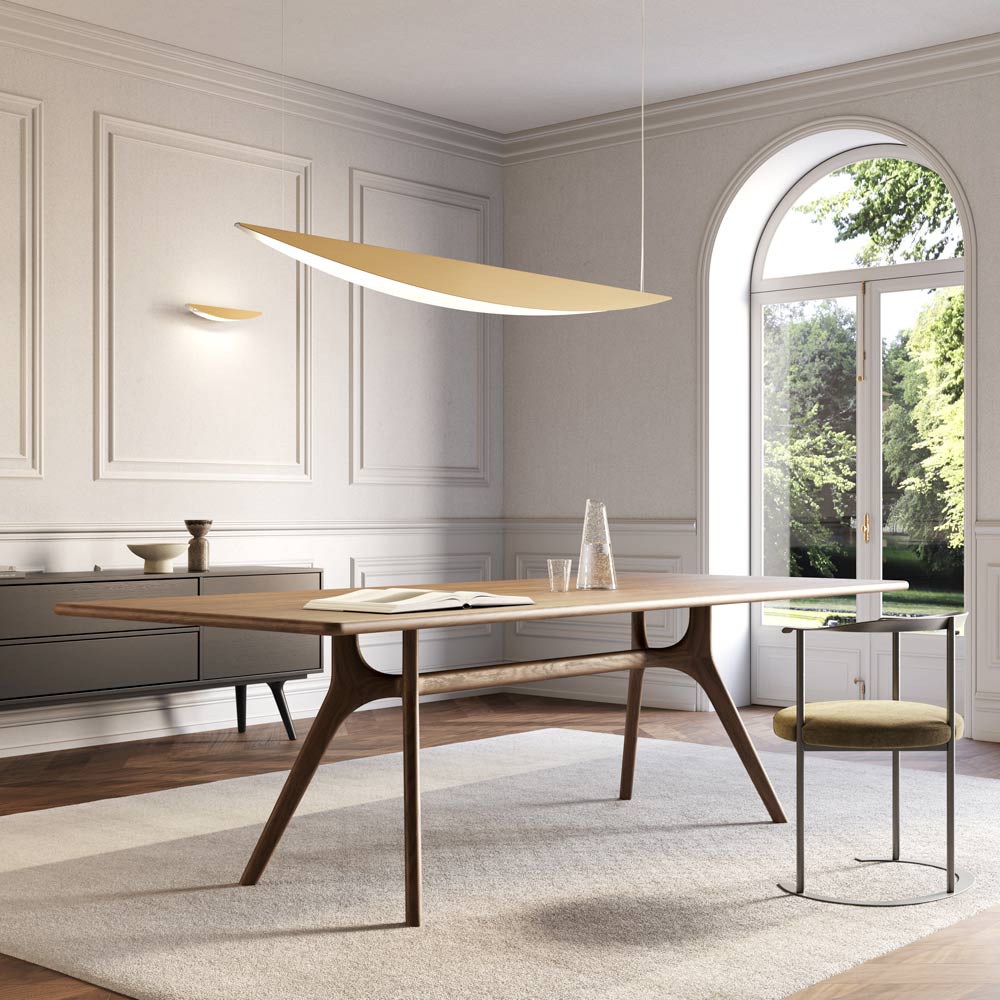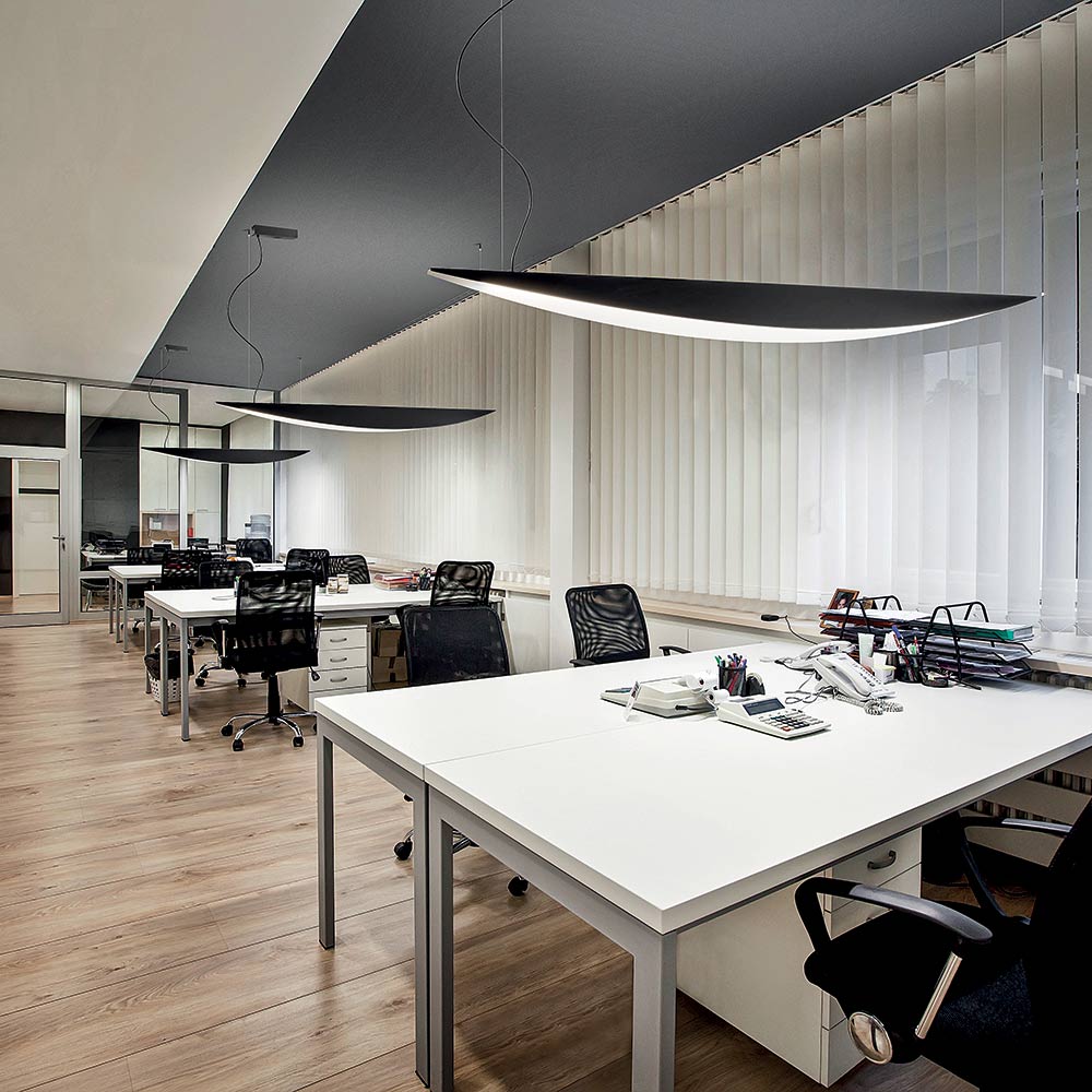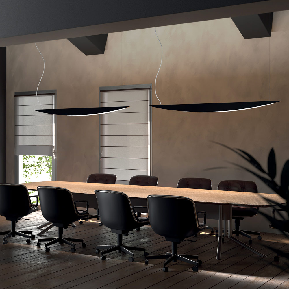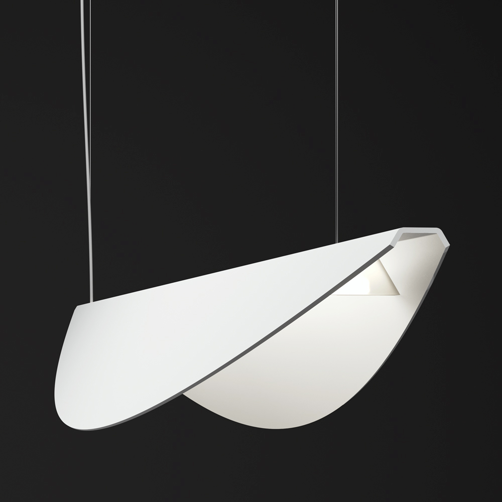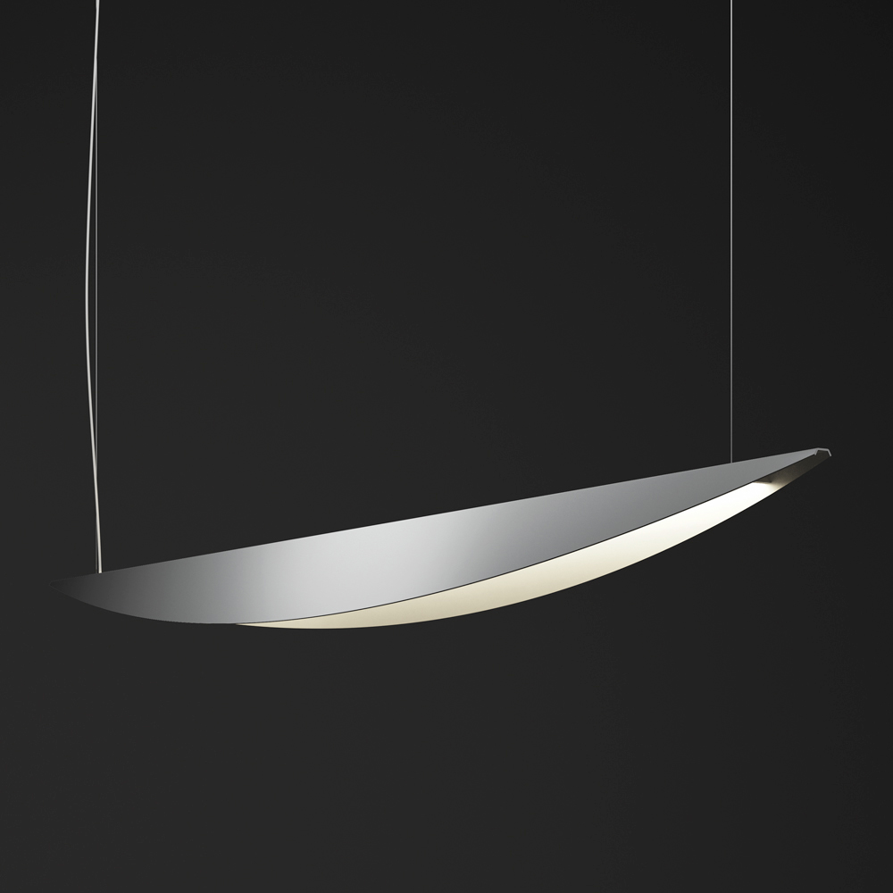Tato závěsná lampa ztělesňuje dokonalou kombinaci moderního designu a profesionální funkčnosti . Její zužující se, štíhlý a aerodynamický tvar evokuje profil křídla, což místnosti dodává pocit lehkosti a pohybu .