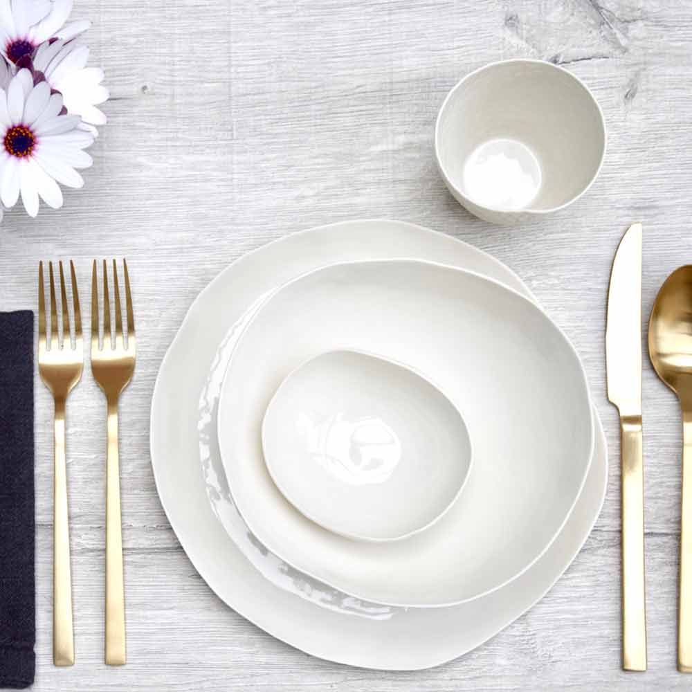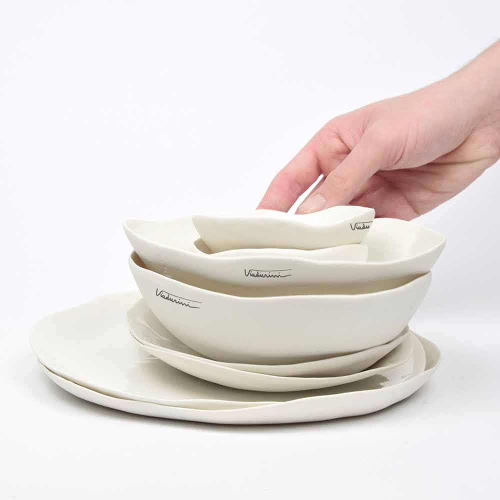 Získané talířovou technikou, která umožňuje získat velmi tenké povrchy, aby se zdůraznily vlastnosti porcelánu a jeho průsvitnost, jsou nádobí poté glazovány průhledným krystalickým vnitřkem a pečlivě vyleštěny zvenčí, což evokuje smyslnost a jednoduchost krásy porcelánu, aniž by obětovat svou praktičnost.