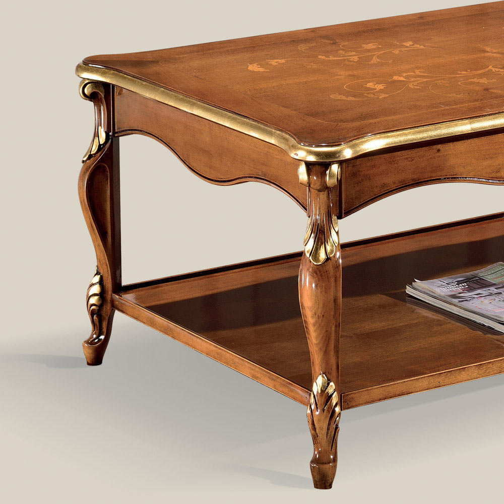 Obdélníkový konferenční stolek z ořechu Bassano a starožitného zlata, s vykládanou deskou a praktickou policí.