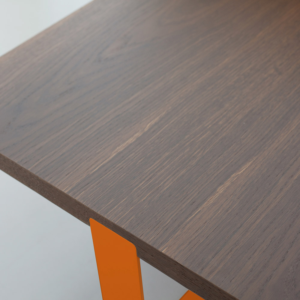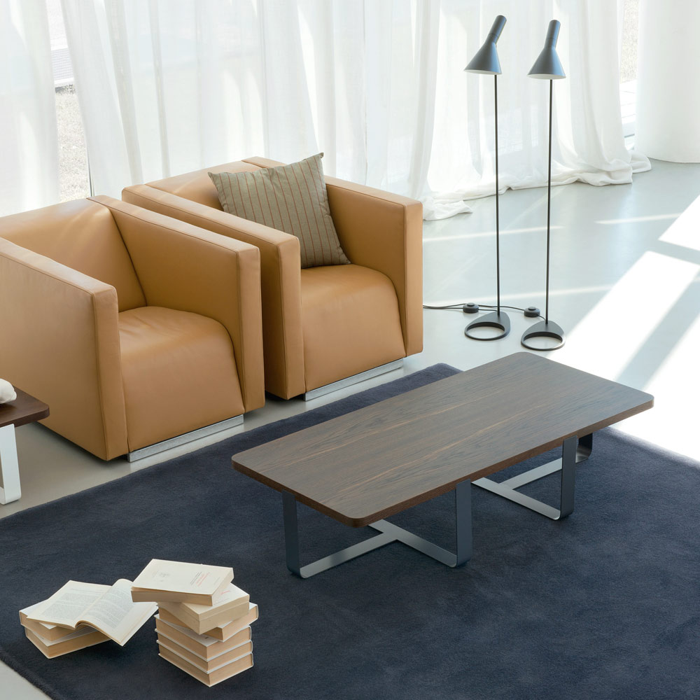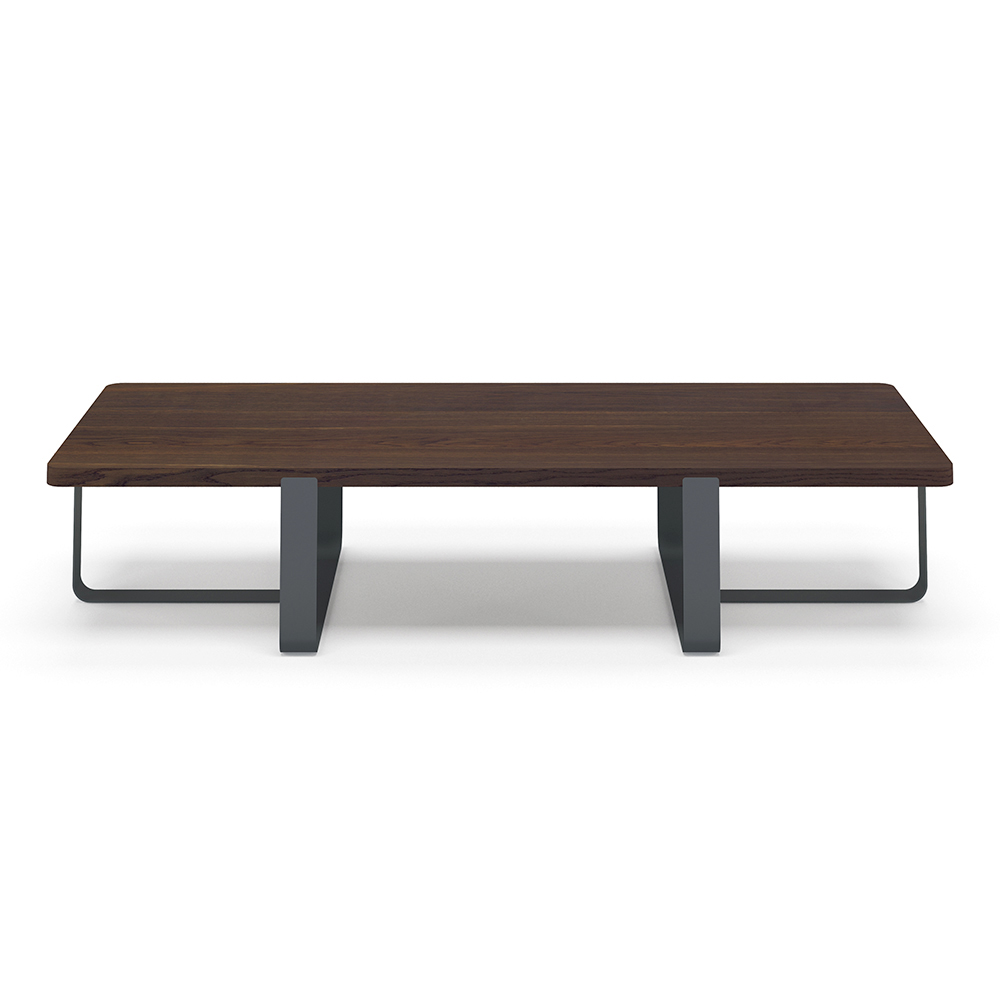 Nízký konferenční stolek do obývacího pokoje s obdélníkovou dýhovou deskou a barevným kovovým podstavcem, luxus vyrobený v Itálii.