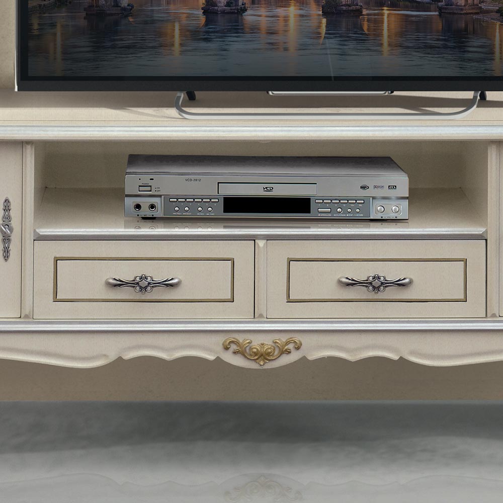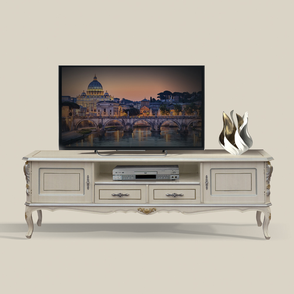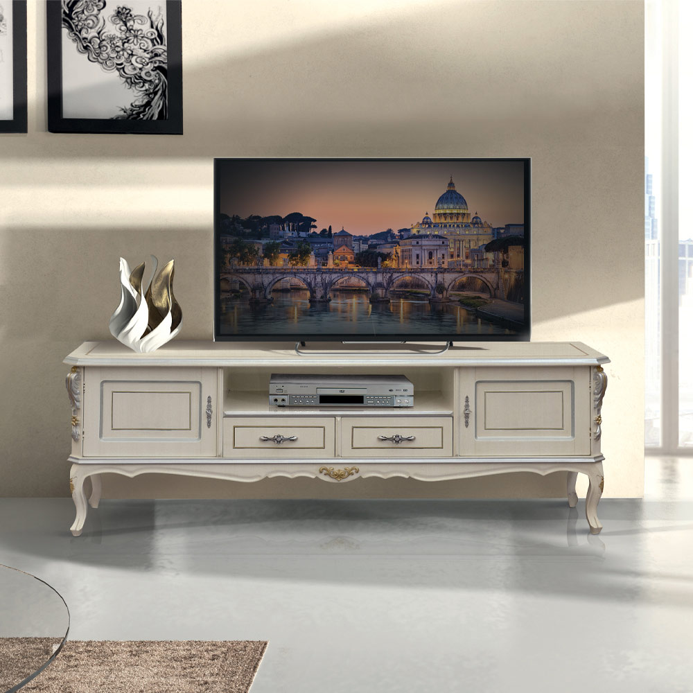 bílého dřeva se stříbrnými akcenty , dostupný se 2 dvířky a 2 zásuvkami nebo se 2 dvířky, 1 zásuvkou a 1 přihrádkou, je ideální do každého obývacího pokoje.