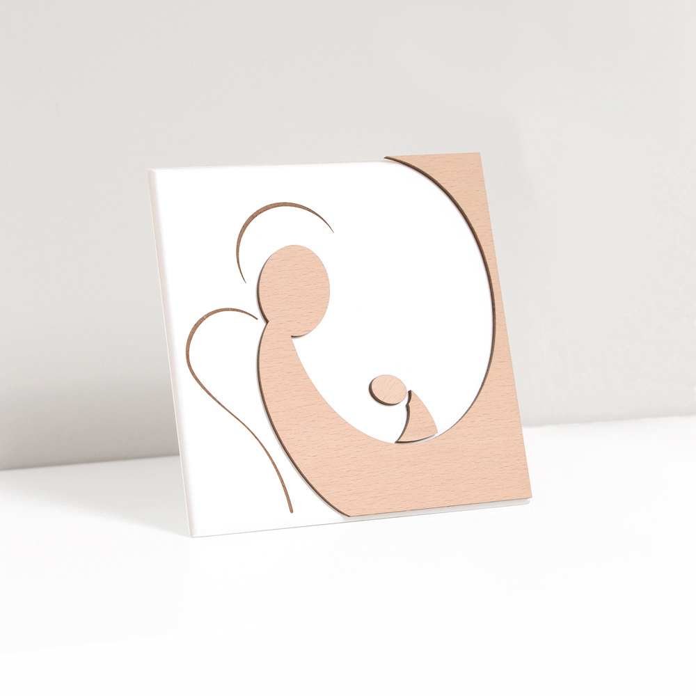Posvátný obrázek s matkou a dítětem v přírodním dřevě . Bílý lakovaný dřevěný panel s opěrnou nohou a otvorem pro zavěšení na zeď.