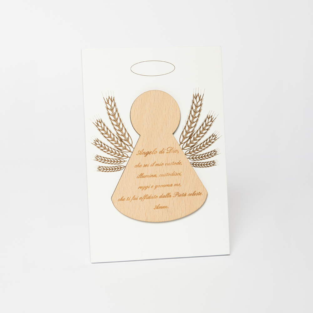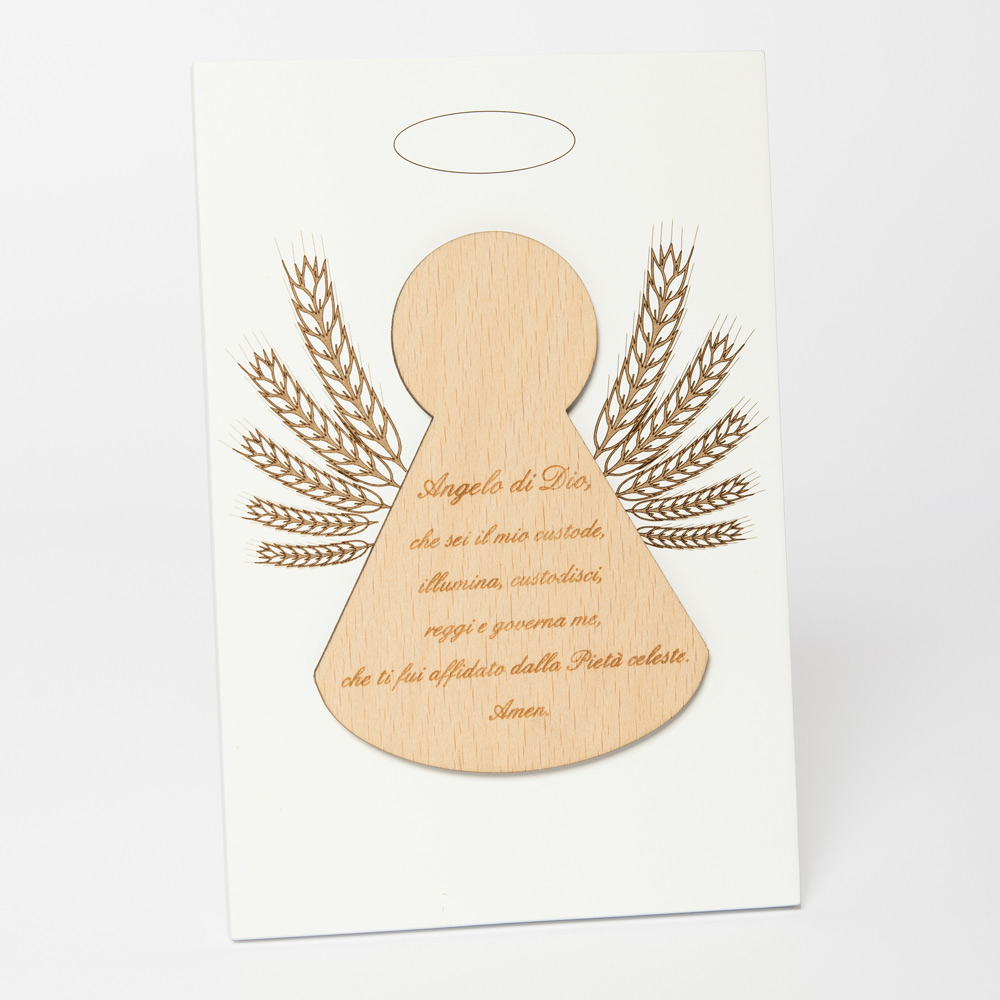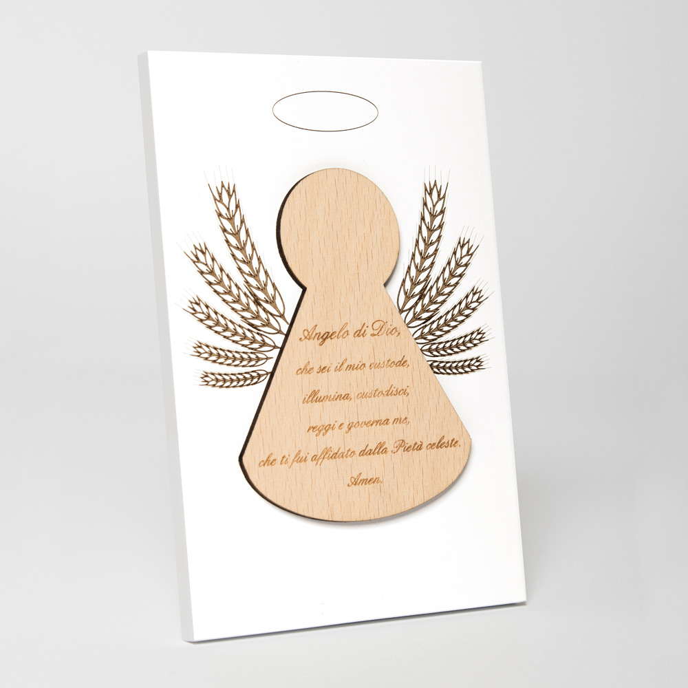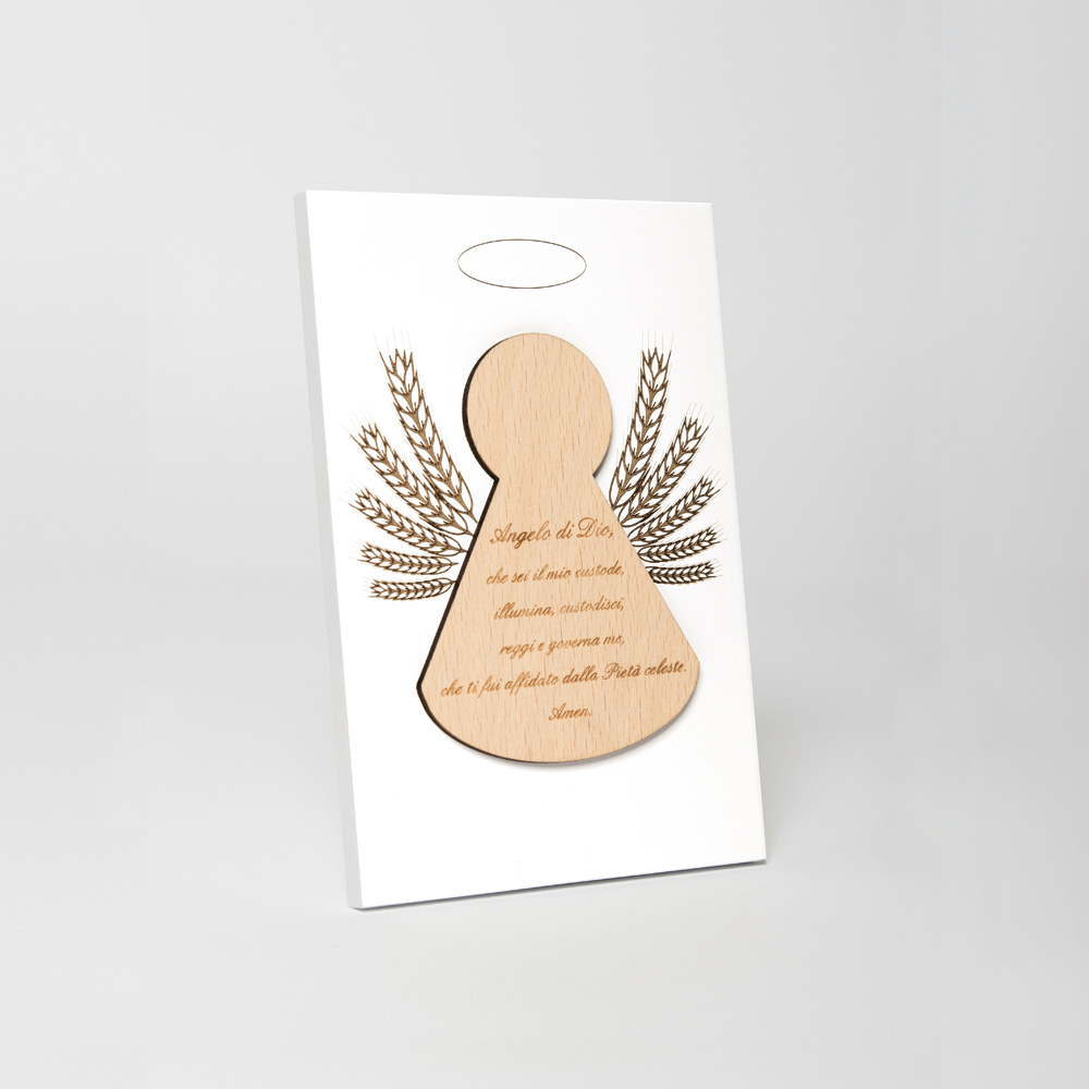 Posvátný obrázek s aplikací anděla s vyrytou modlitbou. Bílý lakovaný dřevěný panel s opěrnou nohou. Aplikace do přírodního dřeva.