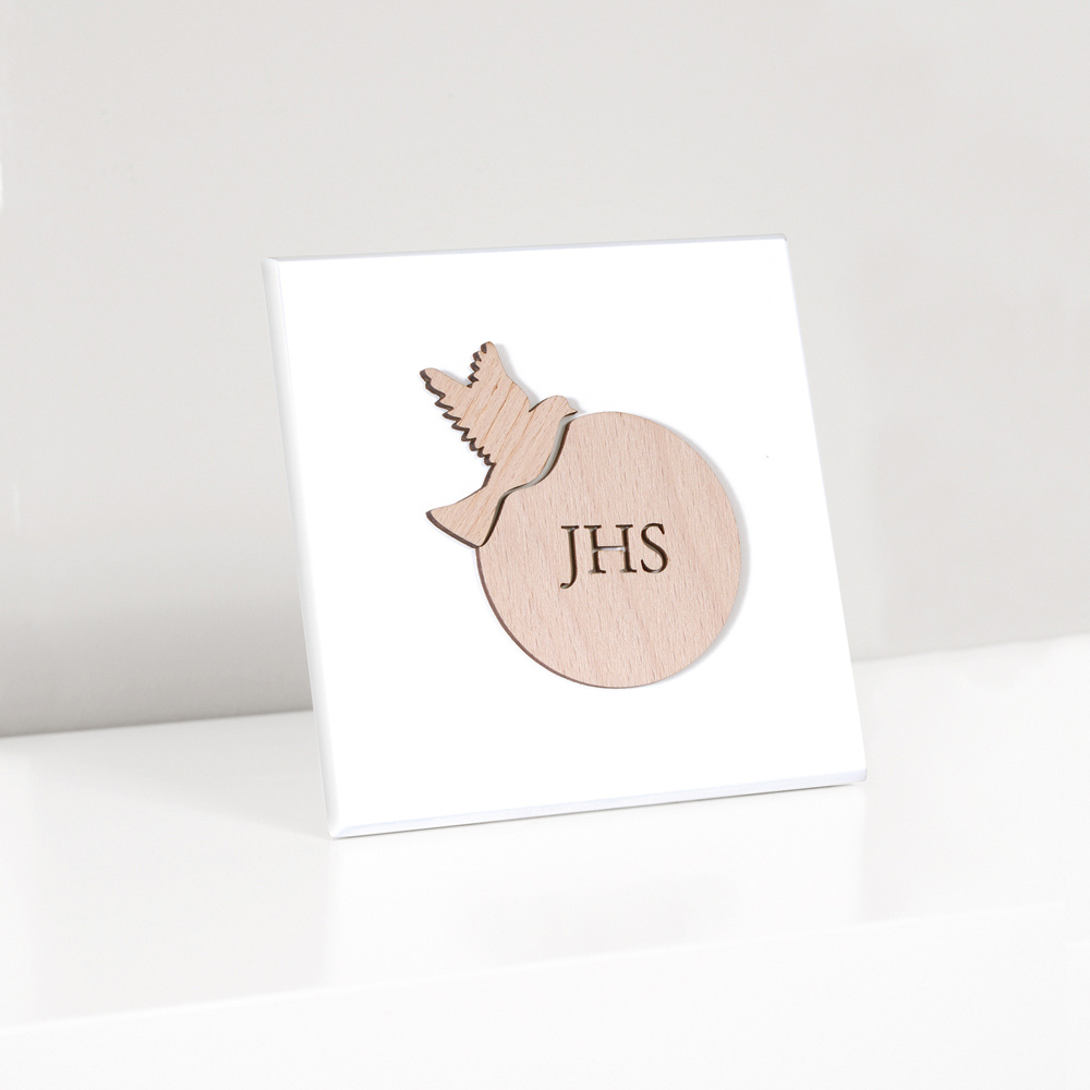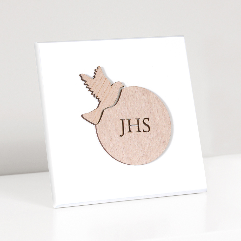 Posvátný obrázek s hostitelem a konfirmační holubicí z přírodního dřeva . Bílý lakovaný dřevěný panel s opěrnou nohou a otvorem pro zavěšení na zeď.