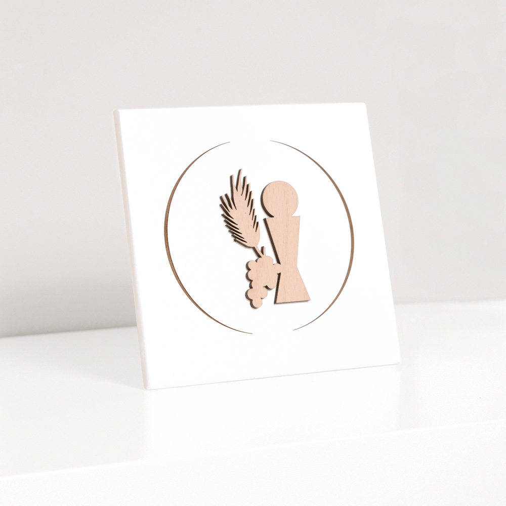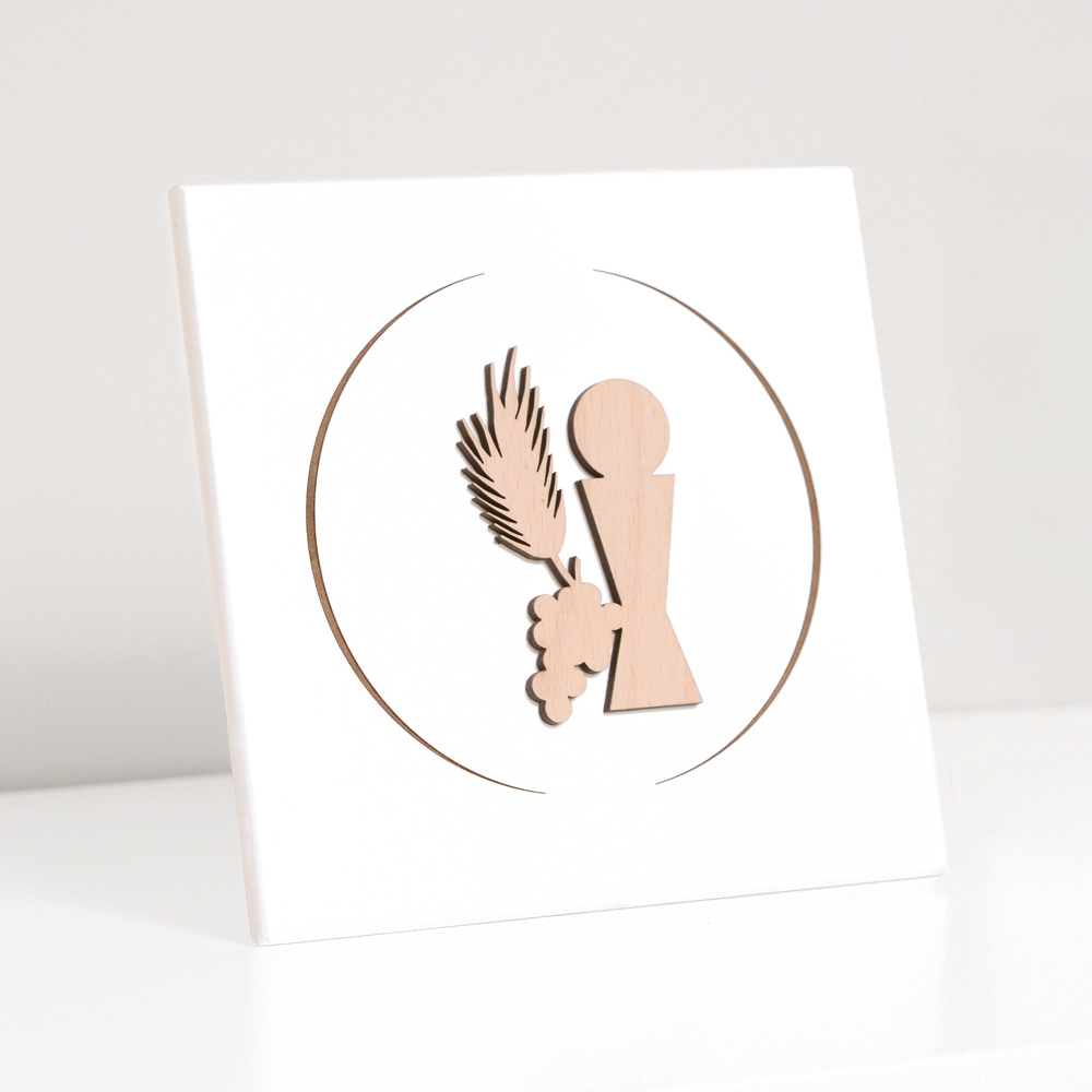Posvátný obrázek s mešním kalichem, klasem a hrozny z přírodního dřeva aplikovaný a vyrytý laserem. Bílý lakovaný dřevěný panel s opěrnou nohou a otvorem pro zavěšení na zeď.