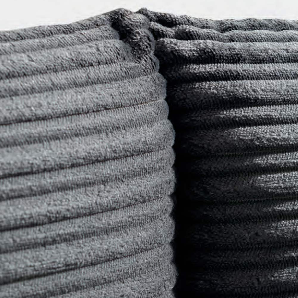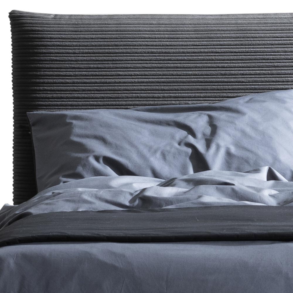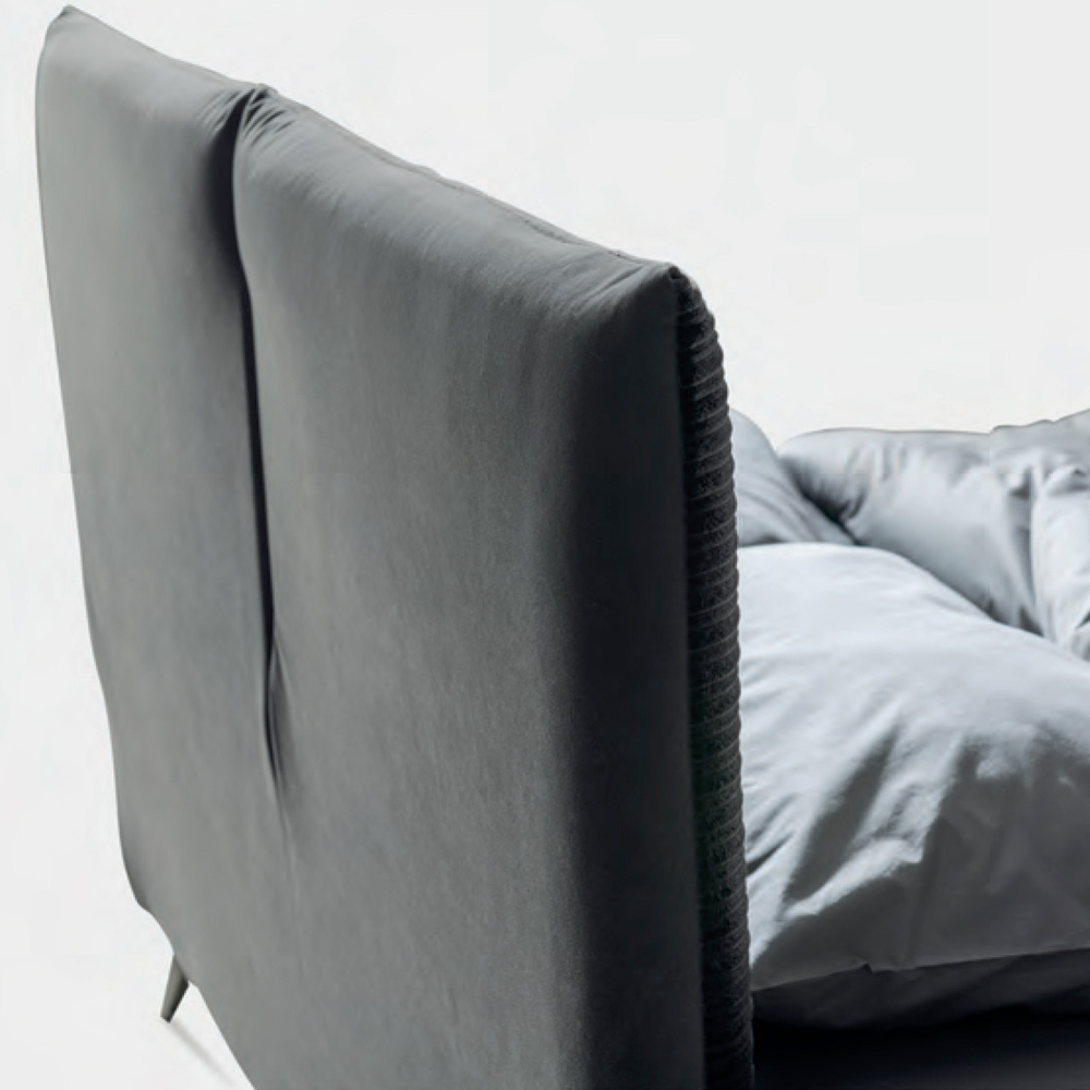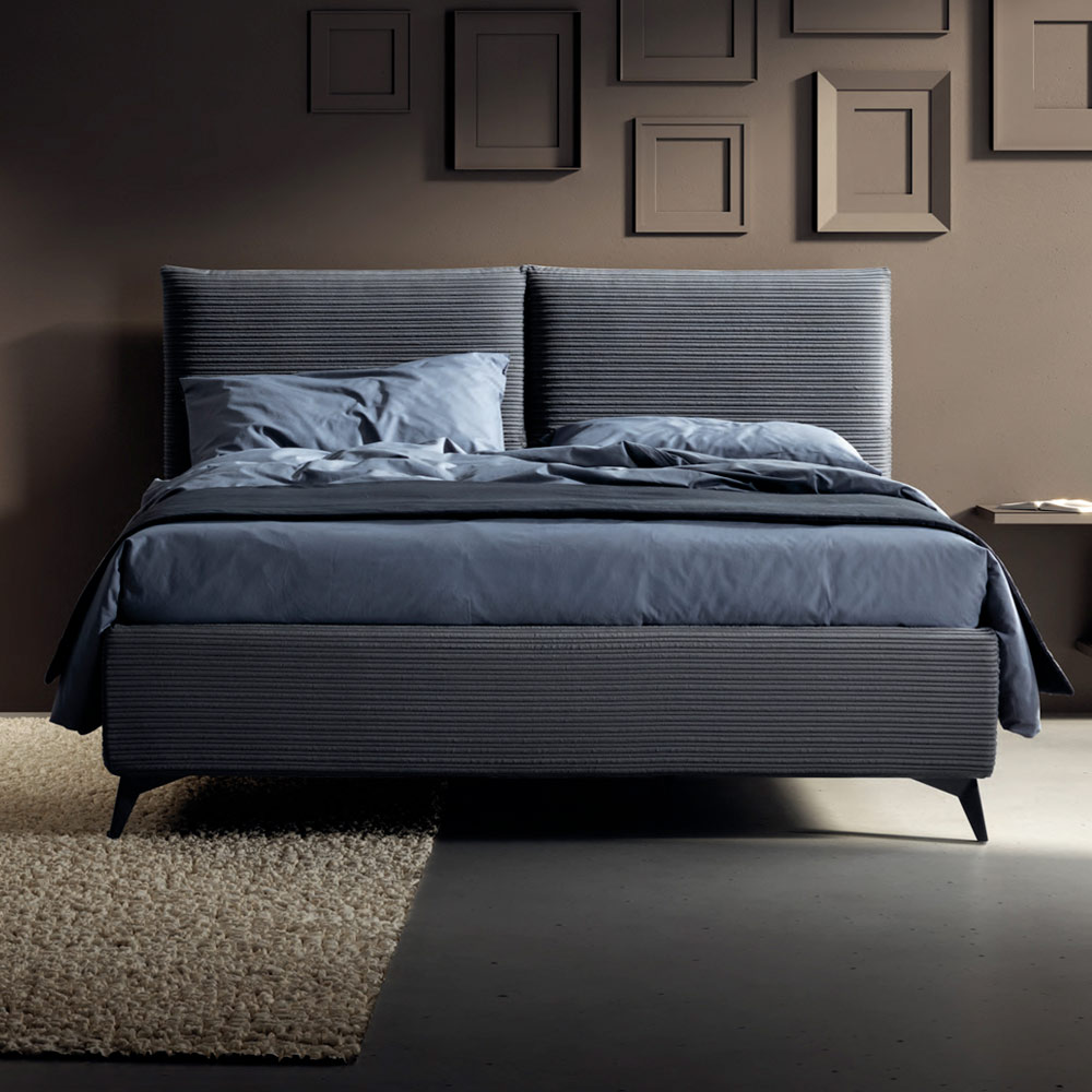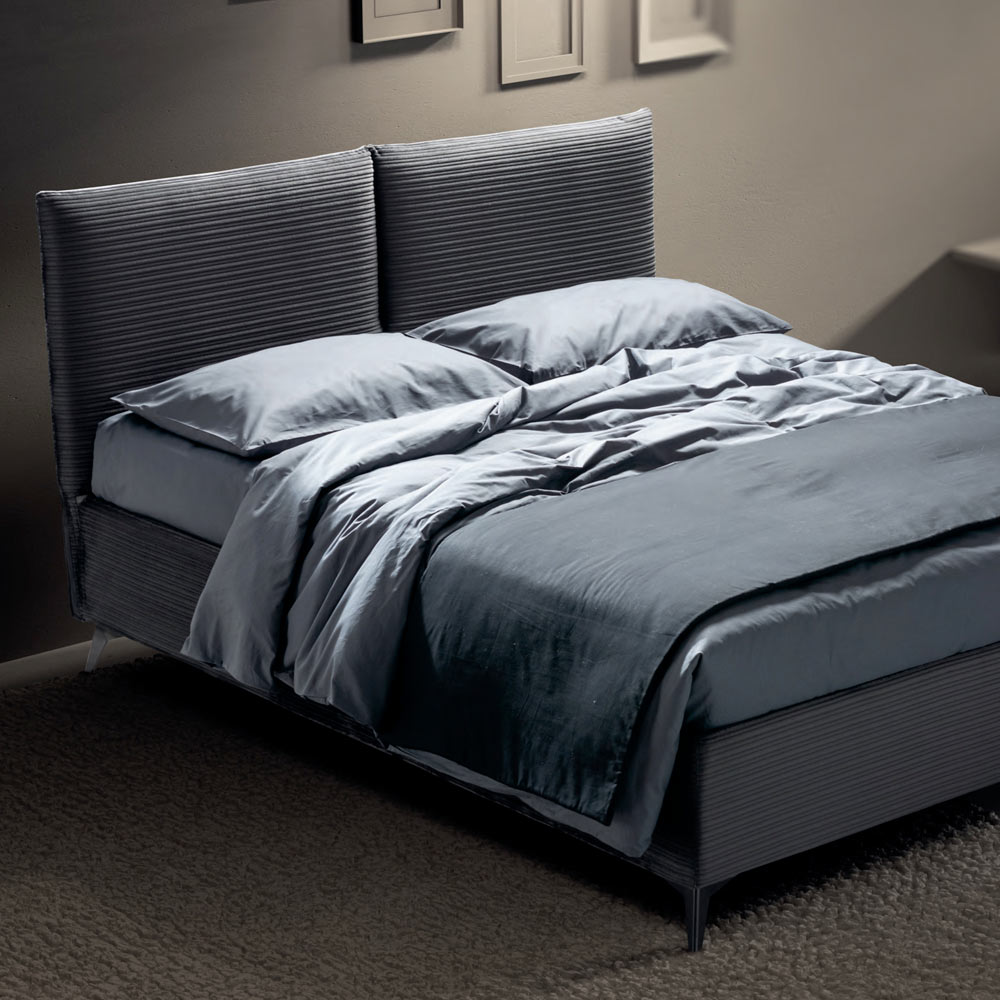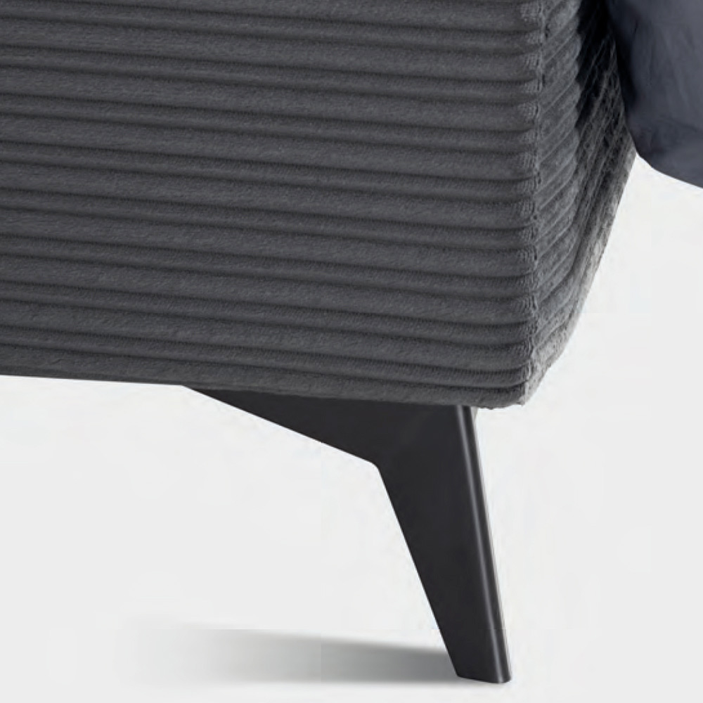 úložným boxem, kovovými nohami v antracitové úpravě (výška 13,5 cm) a měkkým čelem získaným díky speciální polstrování ve tvaru polštáře; centrální členění čela postele mu dodává zvláště čistou a příjemnou linii s originálním estetickým efektem.