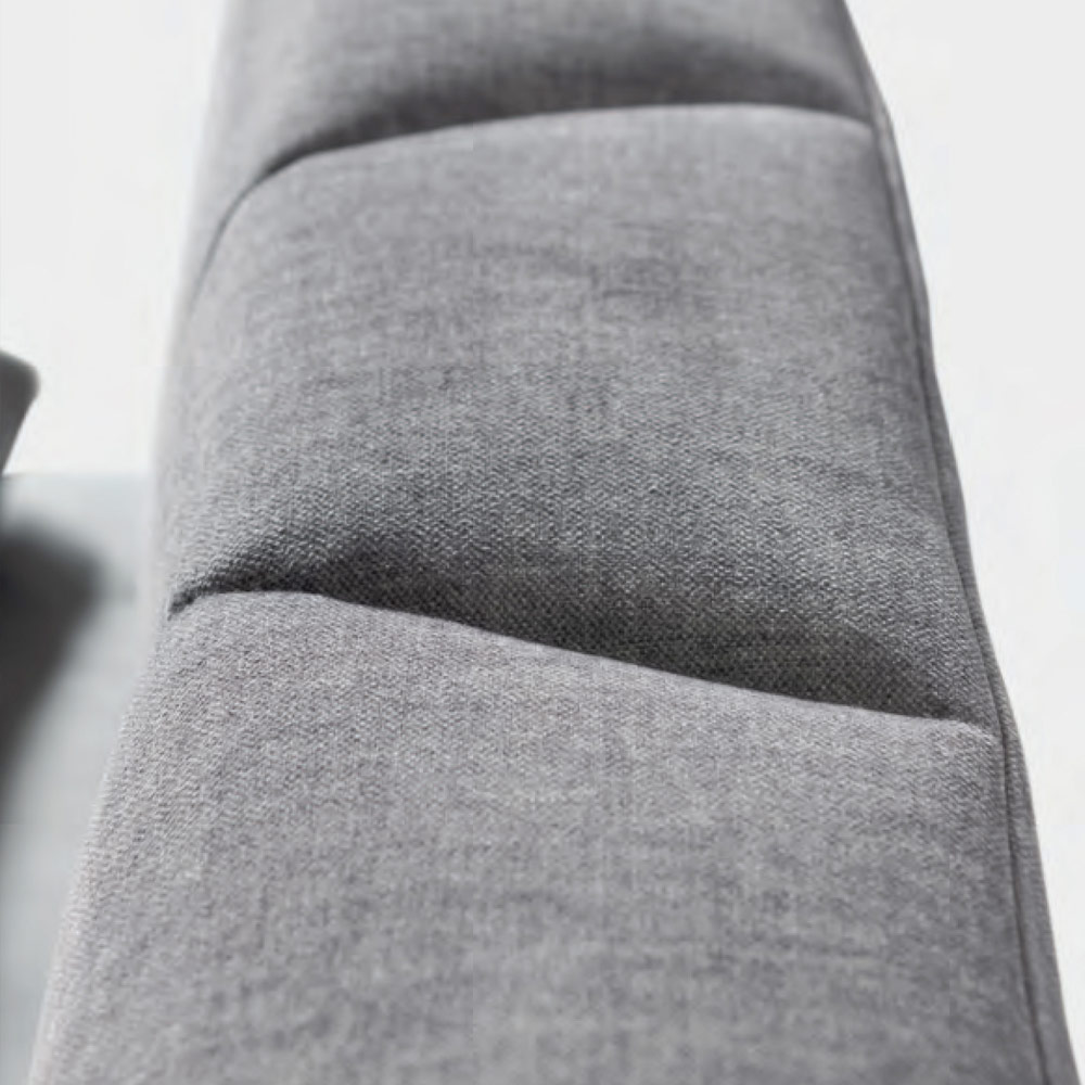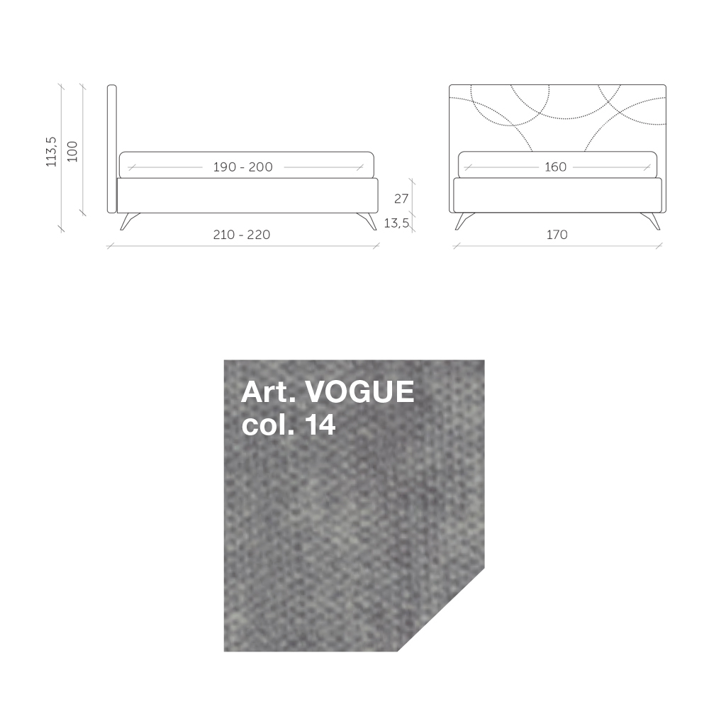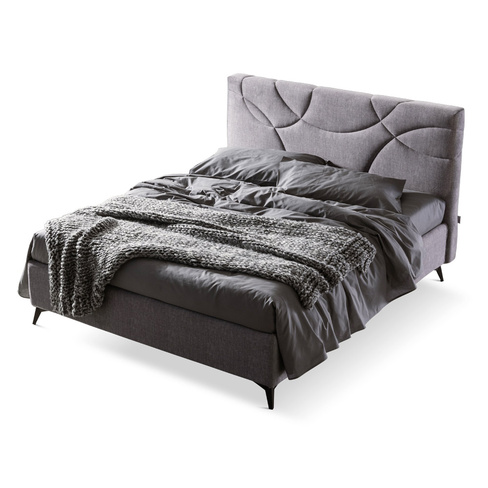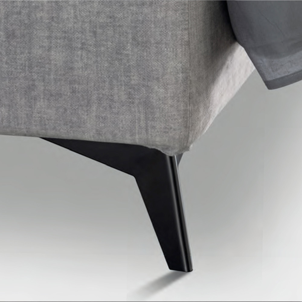 úložným boxem, kovovými nohami v antracitové úpravě (výška 13,5 cm) a silným čelem z ohnivzdorné látky, vyrobené zvláštním procesem prošívání zkřížených křivek, které zvýrazňují její měkkost a propůjčují jí silnou osobnost.