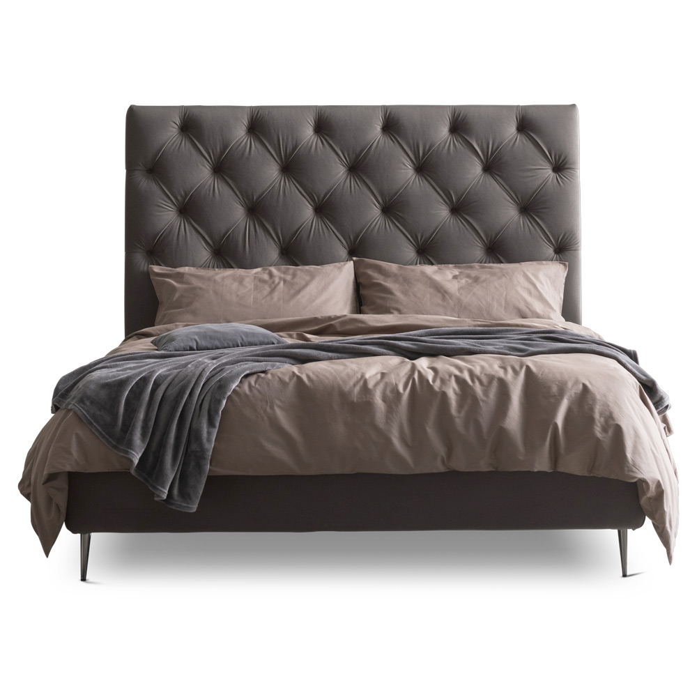 úložným boxem, mokka kovovými nohami (výška 15 cm) a charakteristická precizně prošívaným zpracováním čela z ohnivzdorné látky a značnou výškou, která ji činí jedinečnou a elegantní.
