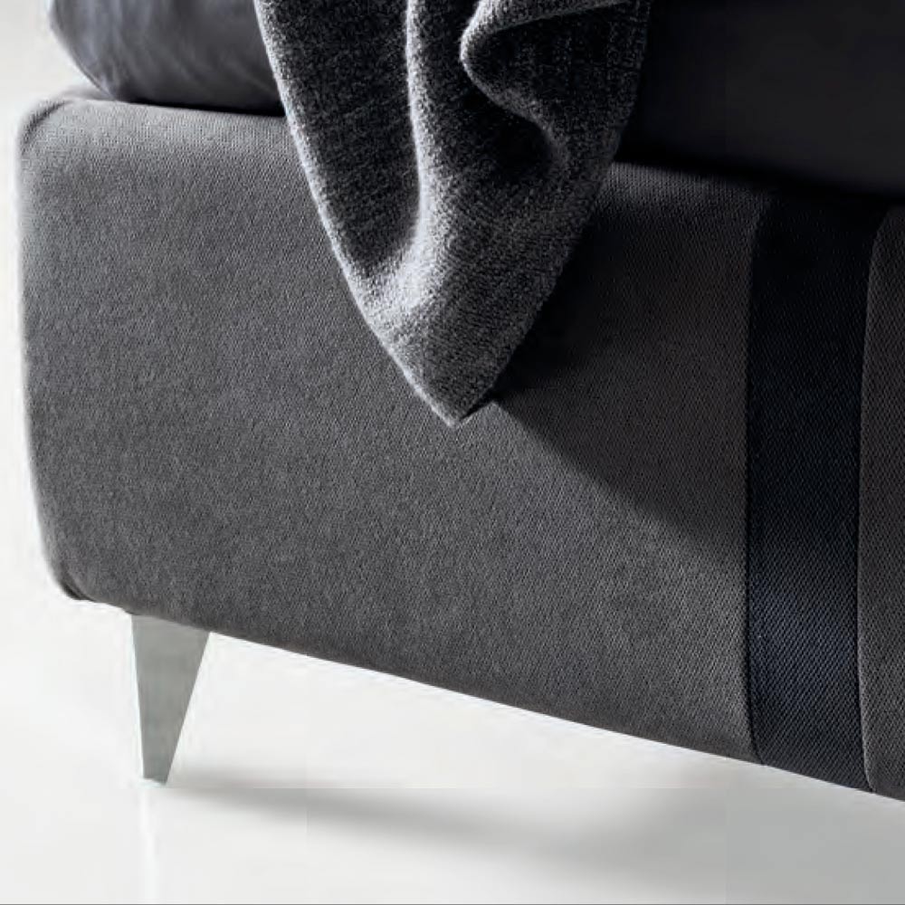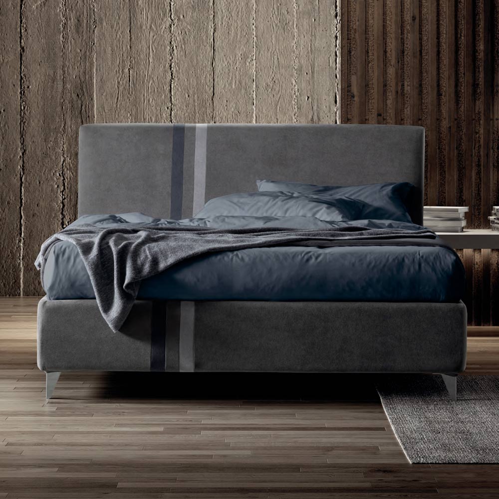 úložným boxem, kovovými nohami s leštěnou ocelí (výška 12 cm) a čelem vyznačující se povrchovou úpravou se dvěma dvoubarevnými svislými a paralelními pruhy na čelu a rámu postele z vodoodpudivé látky odolné proti skvrnám .