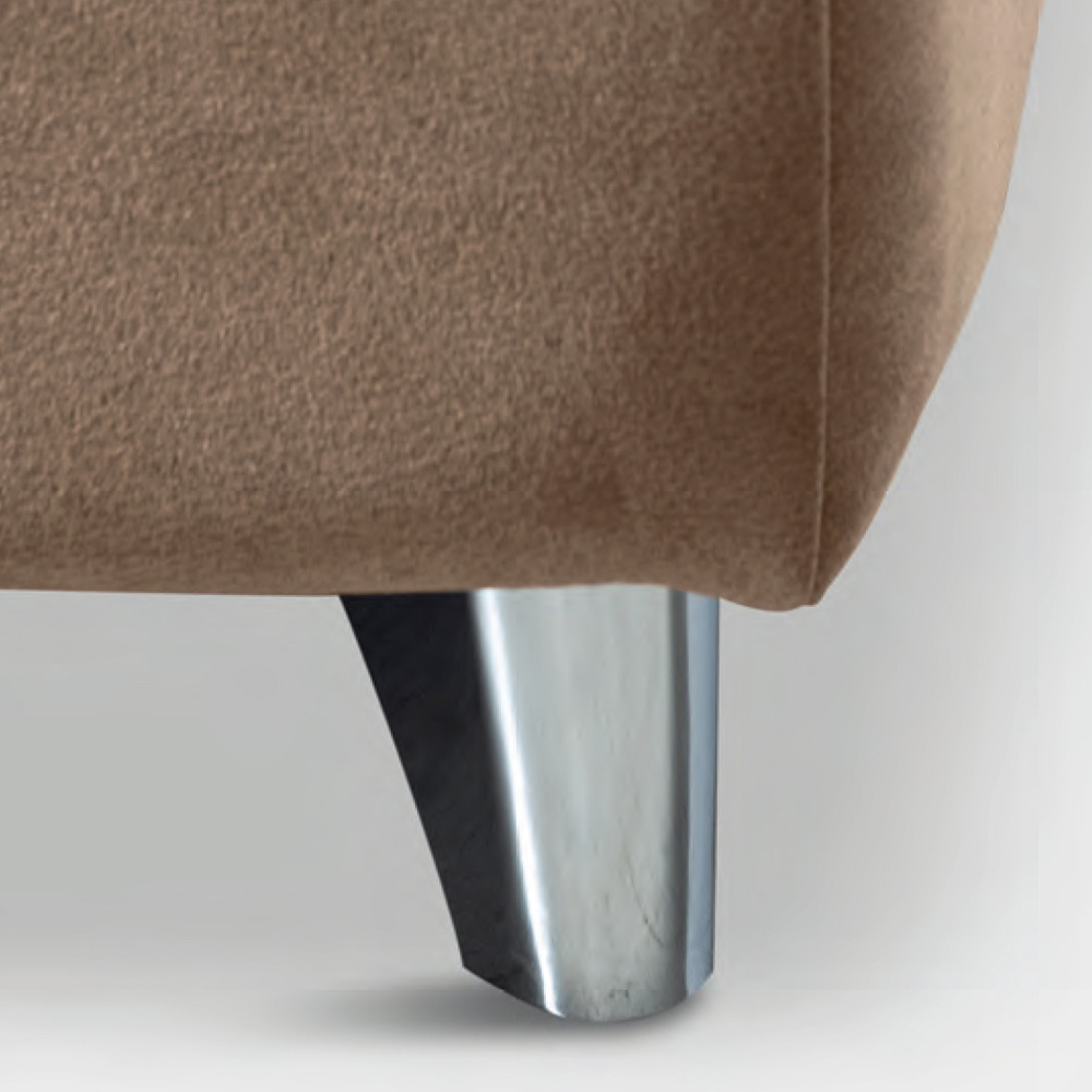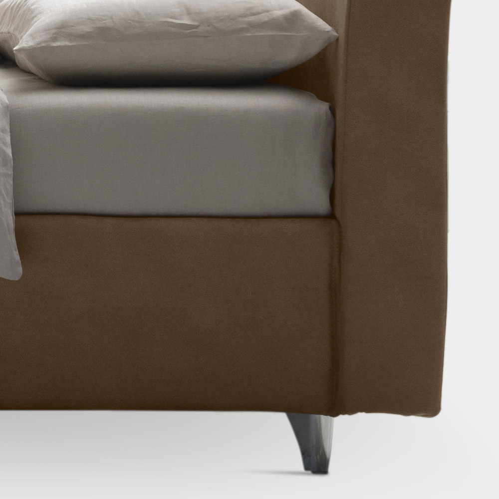 úložným boxem, kovovými nohami s leštěnou ocelovou povrchovou úpravou (výška 10 cm) a zakřiveným čelem značné tloušťky, díky čemuž je postel protagonistou prostorných a rafinovaných prostředí. Zpracování, které se vyznačuje zvýšeným a kontrastním prošíváním ve středu čela postele, nabízí dotek přizpůsobení produktu z látky odolné vůči skvrnám.