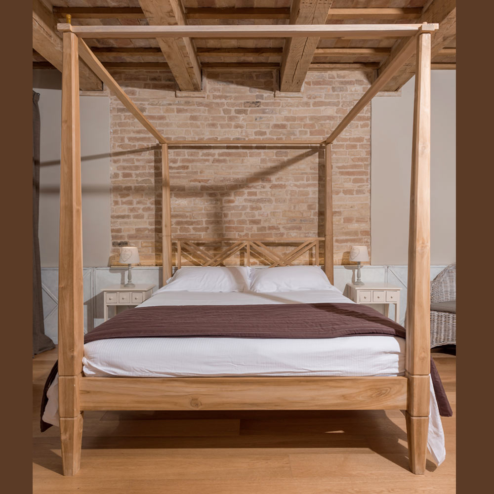 Tato masivní teaková postel s nebesy je okouzlujícím kusem nábytku, který dokáže proměnit ložnici v rafinovaný a evokující prostor. Masivní konstrukce a řemeslné zpracování zdůrazňují přirozenou kresbu dřeva a vytvářejí teplou a elegantní atmosféru s nadčasovým nádechem.