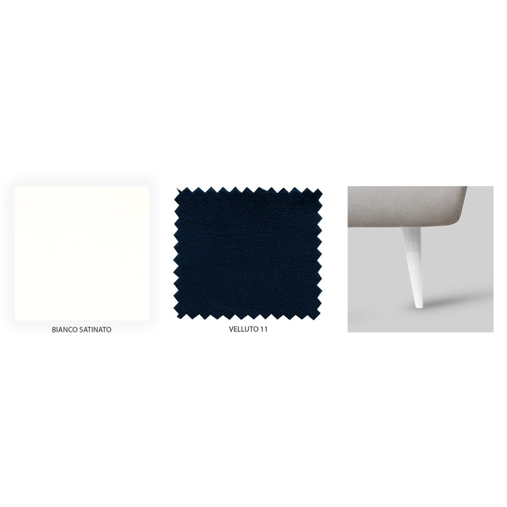 - Model H 25 stop: saténové bílé čelo, šedo/modrý 11 sametový rám postele a bílé dřevěné nohy