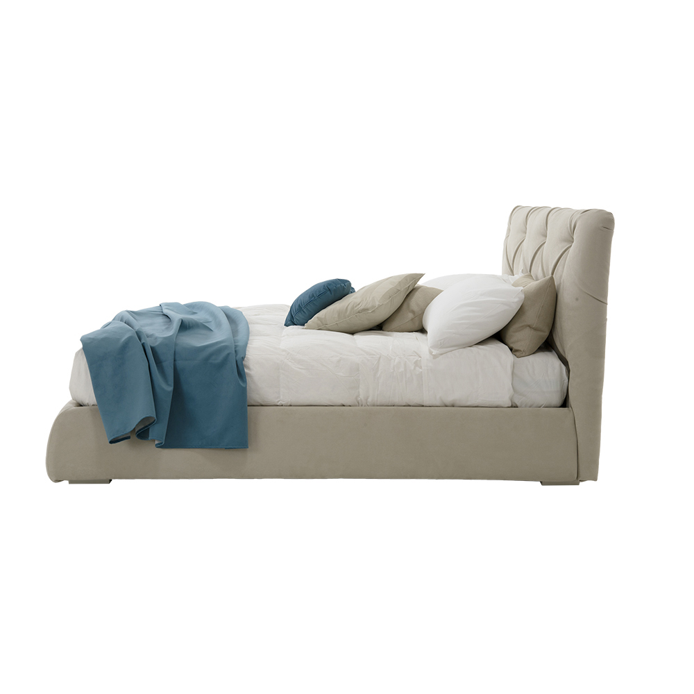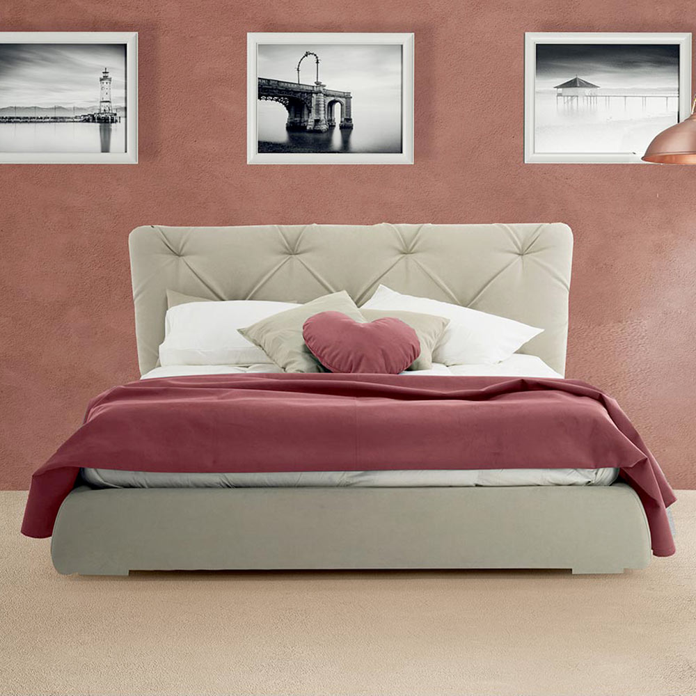 Moderní manželská postel s kontejnerem, polstrovaná a potažená látkou nebo ekokůží ručně vyráběná v Itálii.