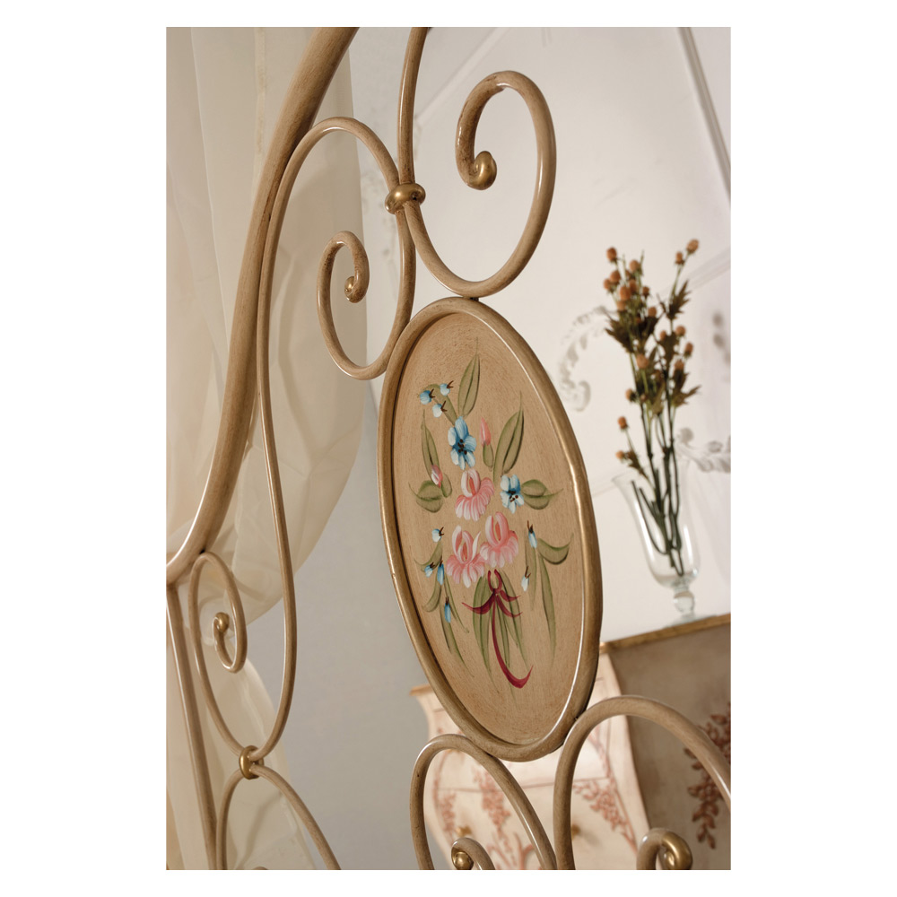 povrchovou úpravou práškovou barvou ve starožitné barvě slonové kosti. Tato postel je volbou charakteru s rozhodně klasickou chutí, která obsahuje bezkonkurenční jemnost a jemnost. Květinový detail na čelu postele je ručně vyroben s velkou péčí a pozorností, aby dodal produktu jedinečný a neopakovatelný nádech.