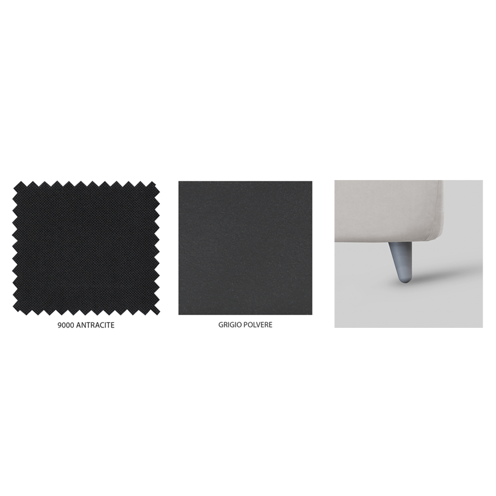 potažené látkou v antracitové barvě s šedými polypropylenovými nožičkami.